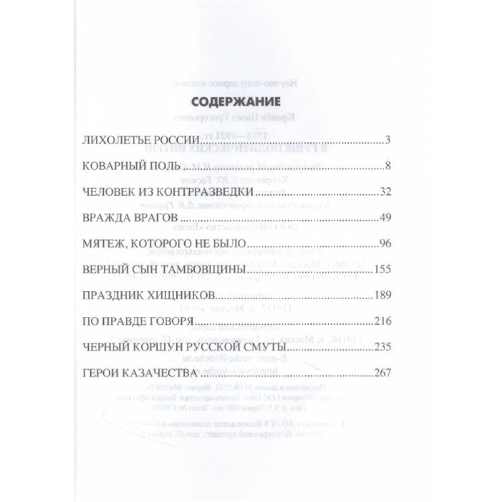 Данная книга Павла Кренева, как он себя сам позиционирует – ветерана спецслужб и кандидата юридических наук, посвящена серии очерков о Гражданской войне. Здесь мы можем прочитать авторскую интерпретацию событий, связанных с мятежом левых эсеров в 1918 году, деятельности Якова Свердлова, вожака повстанцев Антонова, прототипах героев произведений Михаила Шолохова и т.д. Казалось бы, новый взгляд на деятельность персонажей очерков Кренева можно только приветствовать, если бы не одно НО. В своих трудах Кренев не приводит никаких ссылок на источники, исследования, материалы, которыми он пользовался, освещая то или иное событие о котором пишет, а дает волю полету своей фантазии. Судите сами. Так, на стр. 50 Кренев пишет «А. Керенский в угоду США разваливал руководящие звенья государства, чтобы разрушенная Россия попала в руки… Америки и Англии. А возглавить ее после Керенского должен был Лев Троцкий». Спросите, а где факты? А зачем, у Кренева все просто - «как теперь совершенно очевидно» и все на этом. Кому очевидно? Как очевидно? Откуда? Кренев не отвечает и переходит к фигуре В.И. Ленина. Который, естественно, шпион Германии. Доказательства. А зачем? Это и так понятно и «совершенно очевидно». В свое время, по горячим следам, сыщики Временного правительства не смогли доказать эту басню о шпионстве Ленина, да и притом, что ни одна страна не обвиняла его в шпионаже, даже Германия. Что у таких вот, как Кренев на руках, поддельные документы Сиссона, да заявления, вроде «Ленин – шпион и так понятно».