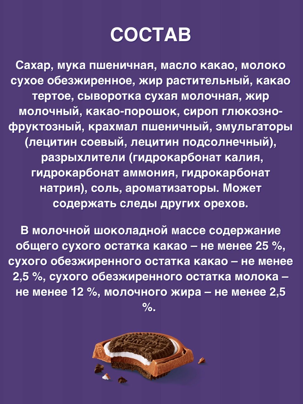 | Состав | Сахар, мука пшеничная, масло какао, молоко сухое обезжиренное, жир растительный, какао тертое, сыворотка сухая молочная, жир молочный, какао-порошок, сироп глюкозно-фруктозный, крахмал пшеничный, эмульгаторы (лецитин соевый, лецитин подсолнечный), разрыхлители (гидрокарбонат калия, гидрокарбонат аммония, гидрокарбонат натрия), соль, ароматизаторы. |
