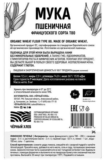 Органическая пшеничная мука французского сорта Т80 получена разовым помолом на мельнице с каменными жерновами из восточного Тироля. Мельница работает на низких оборотах, мука при выбое не нагревается выше 40С и сохраняет максимум полезных веществ. Эта французская мука сорта Т80 схожа с мукой второго сорта и содержит, по сравнению с мукой первого сорта, большее количество отрубей. Хлебопёки используют её, главным образом, для выпечки столовых сортов хлеба и несдобных мучных изделий. Хлеб получается воздушным, невесомым, с крупными порами и хрустящей коркой.