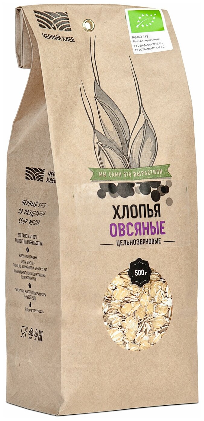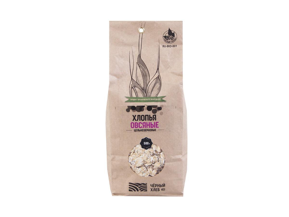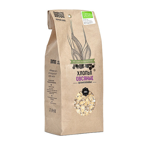 Органический продукт ЕС, сертифицирован по стандартам Европейского союза об органическом производстве. Изготовлен из органического овса голозёрного, который был выращен без минеральных удобрений, ядохимикатов, стимуляторов роста и химических агентов. В составе органических овсяных хлопьев «Чёрный хлеб» - только цельное зерно, при производстве сохранены все его части: питательный эндосперм, богатый витаминами зерновой зародыш и содержащие клетчатку отруби. Овёс не подвергался термической обработке, поэтому хлопья обладают всеми полезными свойствами цельного зерна.