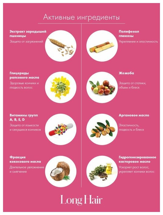 - 8 незаменимых аминокислот - дают волосам максимальное количество строительных белков, витамины группы B, лейцин и фенилаланин восстанавливают, укрепляют, ревитализируют волосы по всей длине