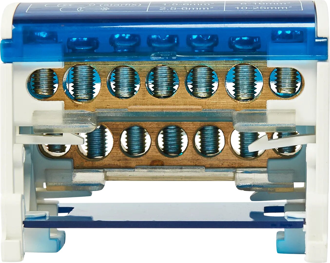 - Шины закреплены в корпусе, который имеет возможность крепления на DIN-рейку 35 мм.