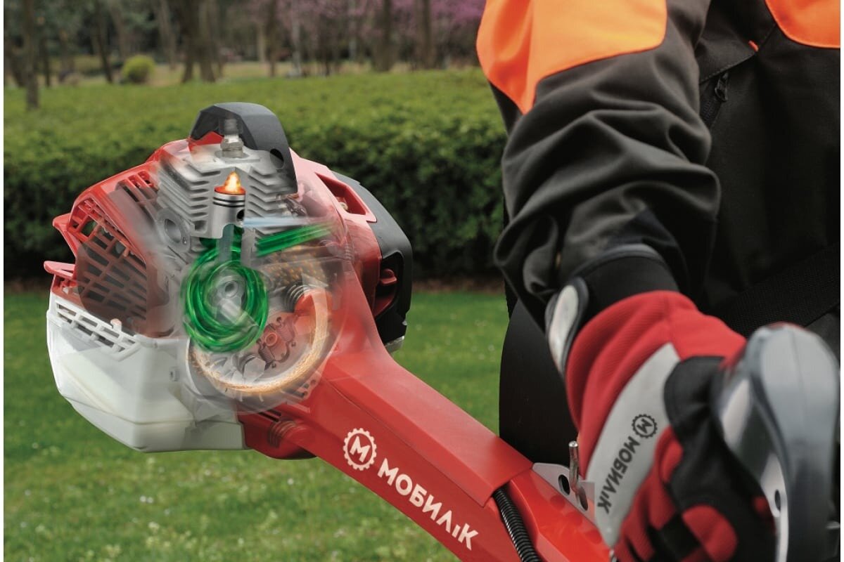 В кусторезах МОБИЛ К применяется 4-х точечная антивибрационная система со стальными пружинами, и действующими как антивибрационными элементами для уменьшения передачи вибраций, вызванных двигателем и режущим инструментом. Поэтому ручки имеют чрезвычайно низкую вибрацию и кусторезом легко и комфортно работать. Триммер комплектуется универсальным защитным кожухом. Такой кожух может использоваться с диском и леской. Это экономит время при смене режущего инструмента.