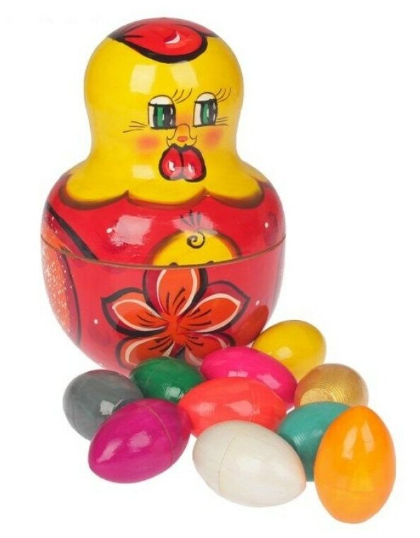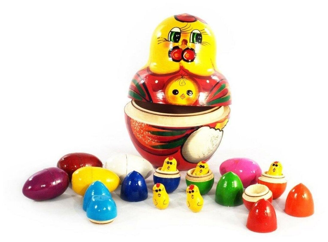 Яйца окрашены в разные цвета, что развивает у малыша еще и цветовое восприятие. Сама курочка сделана из дерева, расписана вручную яркими безвредными красками. Она выполняет роль шкатулки, в которую складываются все детали.