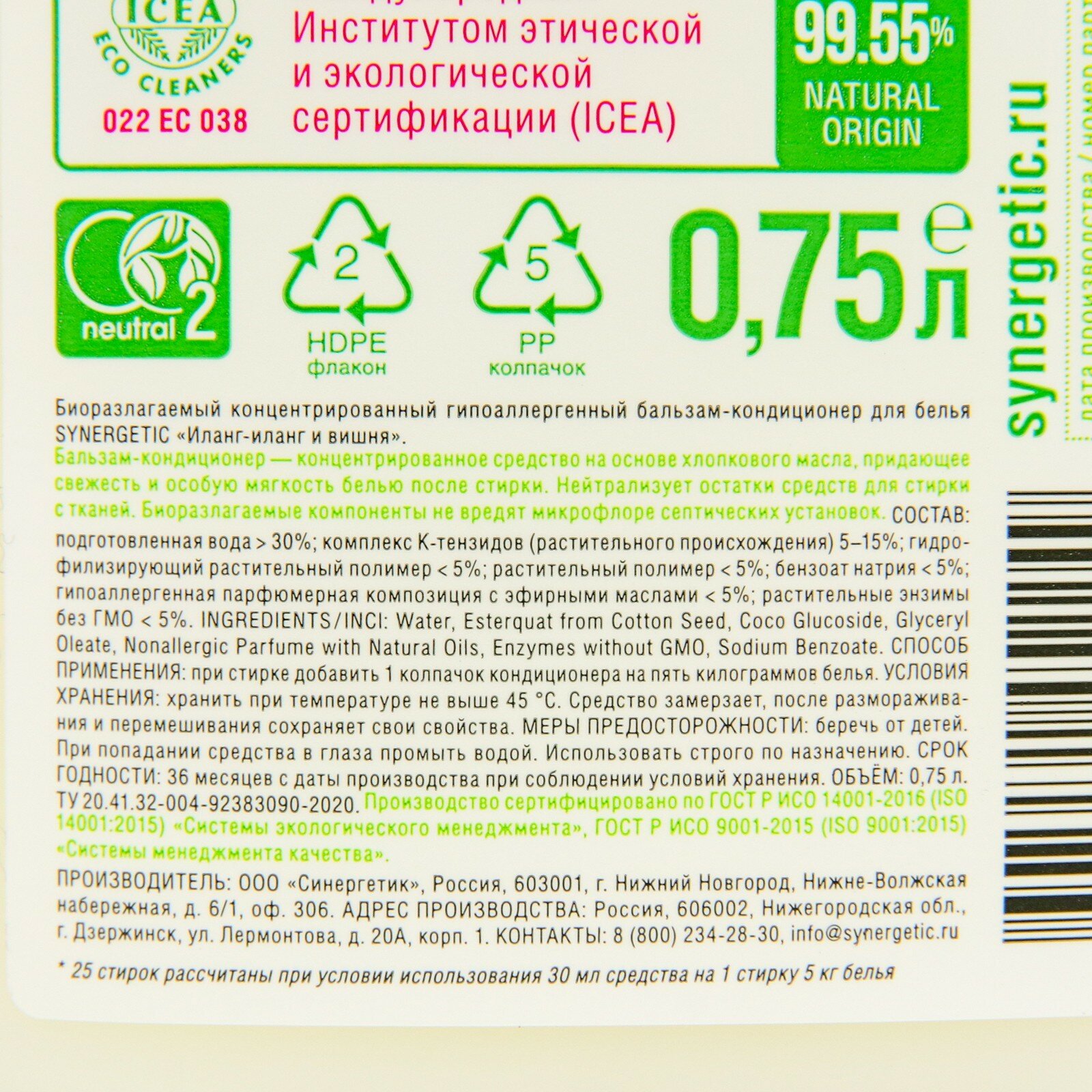 Сервис сравнения цен СкидкаГИД предлагает сравнить цены на товар «Биоразлагаемый гипоаллергенный бальзам-кондиционер Synergetic "Иланг-Иланг и Вишня" 750мл (110073)»