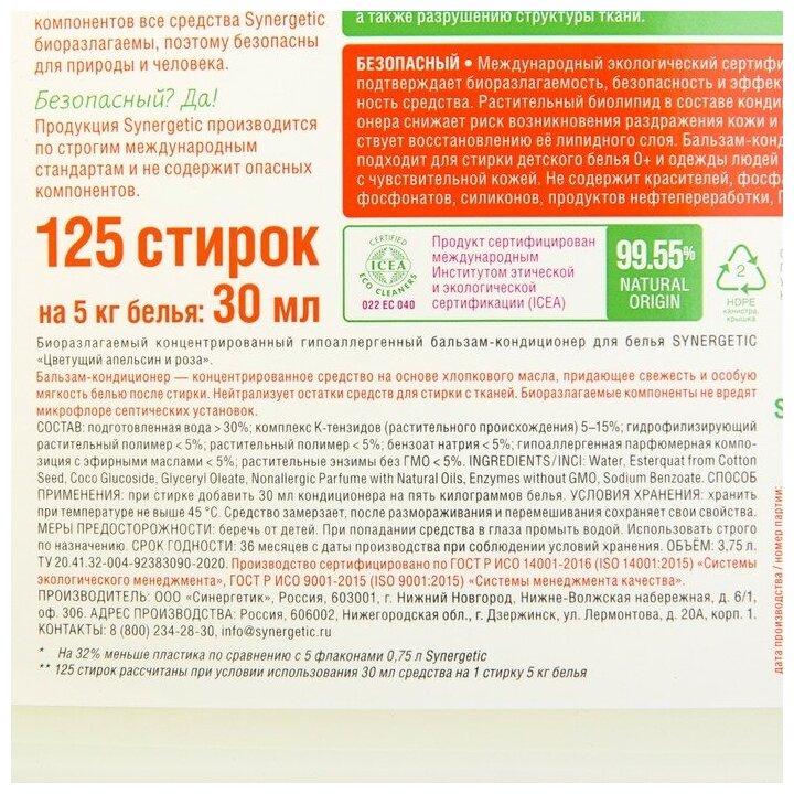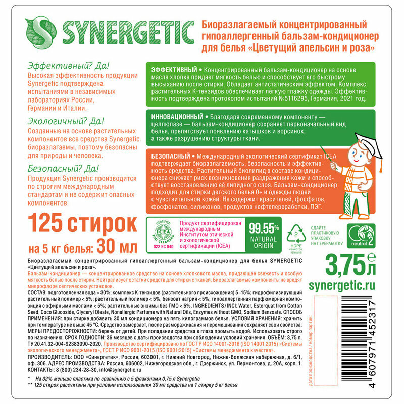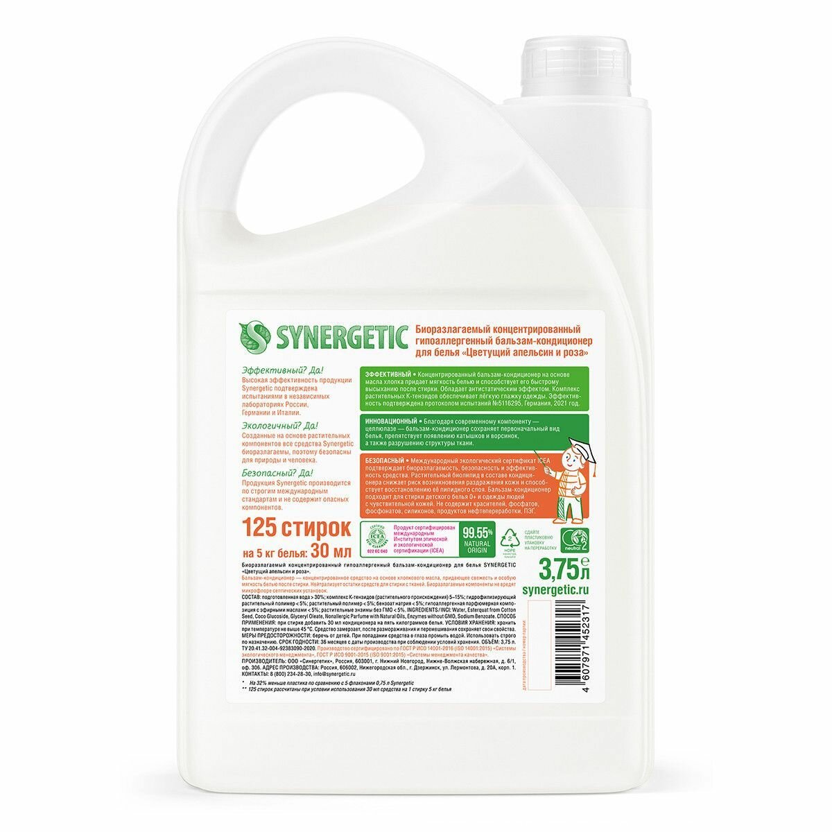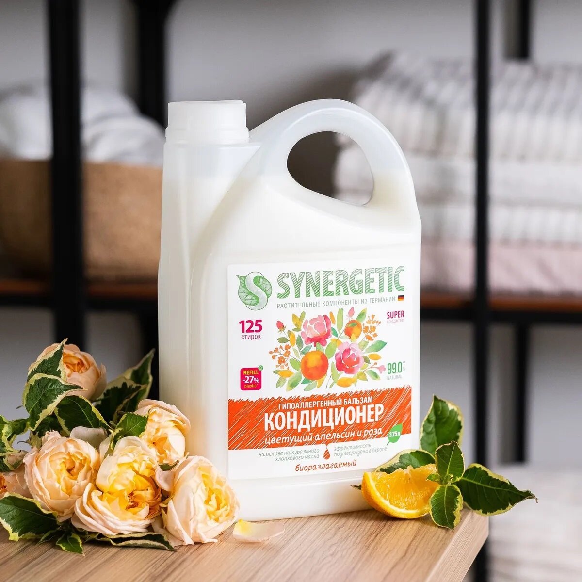 Биоразлагаемый гипоаллергенный бальзам-кондиционер Synergetic "Апельсин и Роза" 375л Цветущий апельсин и роза