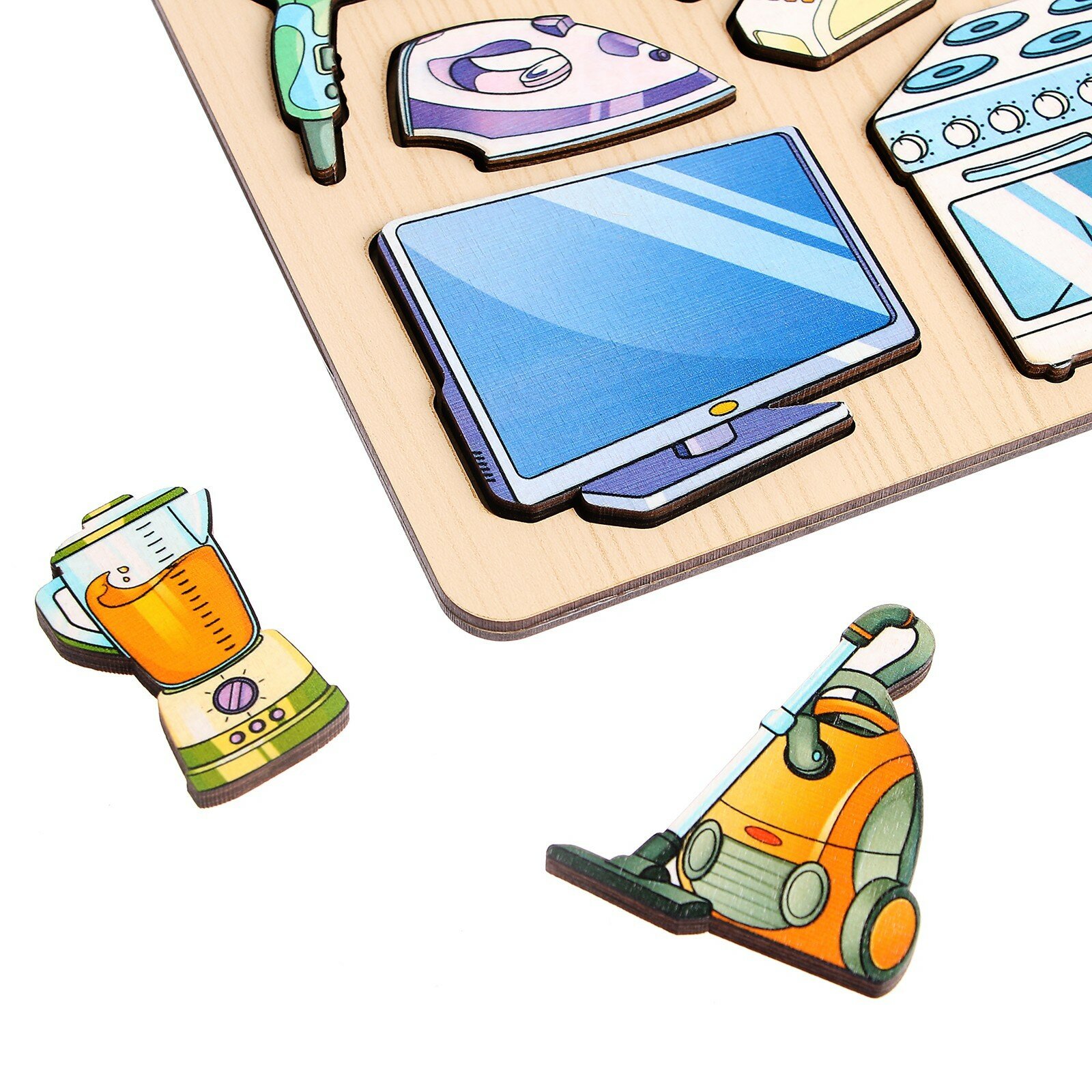 Деревянная доска "Бытовая техника" - это игровая панель для развития мелкой моторики, логики, внимания, усидчивости и воображения вашего малыша.