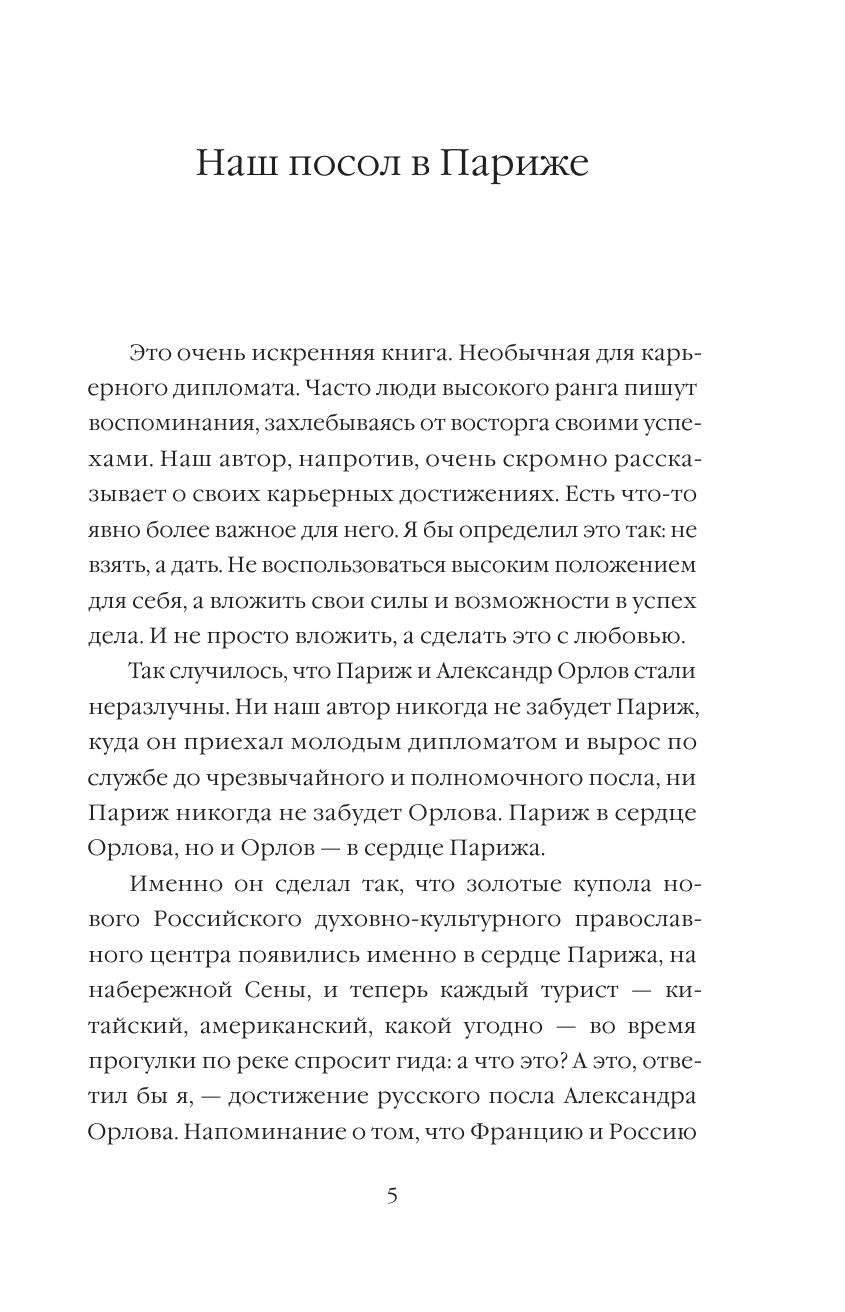 Только что закончила чтение книги Александра Орлова «Посол в Париже» и , все ещё находясь под впечатлением, пытаюсь понять , что же зацепило более всего. Потрясающая эрудиция? О, да! Книгу можно читать как учебник, справочник, энциклопедию политических событий, фигур, политиков. Отличный язык? Да! Мемуары написаны так, что читаешь как увлекательный роман. Воссоздание целой эпохи и блестящие моменты жизни дипломата? Да! И это тоже. Читаешь и подгружаешься в то время, когда столько всего происходило в нашей стране и взаимоотношениях наших стран: России и Франции. Все так! Одно перечисление фигур, с которыми по долгу службы пришлось встречаться дипломату, впечатляет: первые политики Франции. России, деятели культуры, экономики. Но все же есть то, что, вероятно, самое важное в этой книге: личность человека. Человека, который сохранил в себе того самого мальчишку, услышавшего однажды по радио «Маленького принца». Просто представляешь, как он с замиранием сердца слушает великую философскую сказку и видит мир таким, как его видел Сент-Экзюпери. Начав дипломатическую карьеру в 23 года ( !!), автор книги не стал снобом, эдаким махровым, чванливым чиновником. Душевность автора чувствуется в каждой строке. Всю жизнь Орлов занимается тем, чтобы сблизить наши страны: Россию и Францию. Прочитав книгу, читатель поразится , сколько всего сделано. Выставки, экспозиции, памятники во Франции и России . И, как венец, дипломатии - возведение Русского духовного центра на набережной Бранли в Париже. Книга будет несомненно интересна не только тем, кто интересуется политикой, отрешениями Франции и России, работой дипломата. Это просто интересная исповедь замечательного человека, которые, к счастью, были и есть в нашей стране.