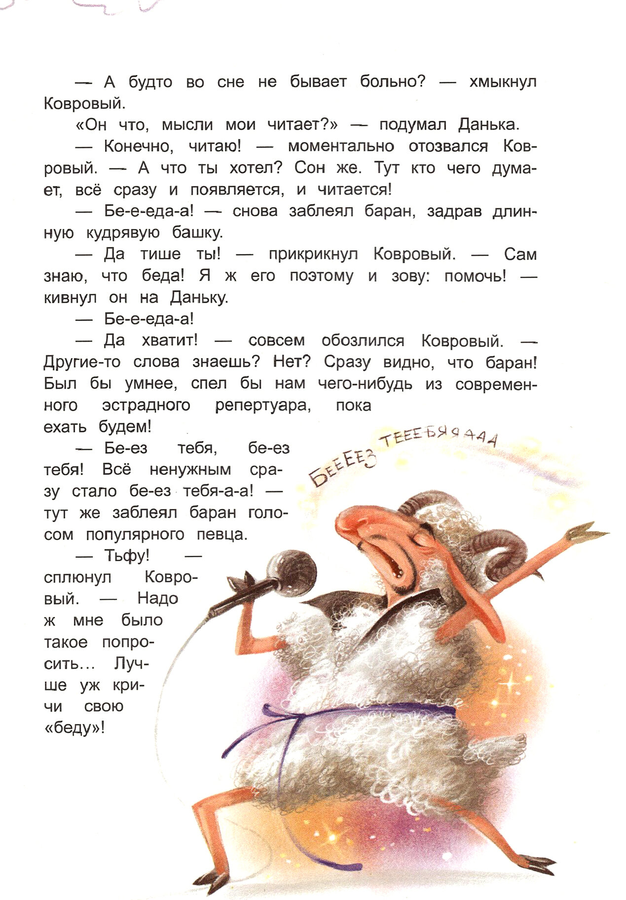 Прочла книжную новинку Дмитрия Сиротина «Королевство имени бабушки». Пройти мимо этой книги просто невозможно. Она великолепно исполнена. Такая красивая, яркая и привлекательная. Романтично розовые, нежно сиреневые и все оттенки фиолетового цвета соединились в единую цветовую гамму и придали книге истинное волшебство. Волшебная цветная дымка проникала на каждую страницу книги и гармонично разместилась рядом с многочисленными сюжетными иллюстрациями Екатерины Варжунтович. А дальше – больше. Открываешь разворот книги и удивляешься: перед тобой предстаёт сказочная страна с высокими замками, остроконечными шпилями, волшебными птицами, разноцветными деревьями, цветами-гигантами... Оказывается, это сказочная страна Ковровия. Именно сюда попадает главный герой книги, мальчик Даня, а сопровождает его маленький ковровый человечек. Здесь всё узорчато, странно и необычно. Как и положено, страной правит король, вернее ковроль, - Ковролин Первый. Это добрый и веселый правитель. Но вот беда! Всё ковролевство нуждается в помощи, ведь ковроль неизлечимо болен чёрной тоской. А пока управляет страной очень неприятный человек – министр Подковерный. У него всё чёрное – волосы, глаза, зубы и даже сердце. А ещё он носит черный атласный ковёр и готовит чёрный-причёрный чай. Он мечтает стать ковролем и поэтому при помощи, будто бы простого чая, пытается устранить нынешнего правителя.