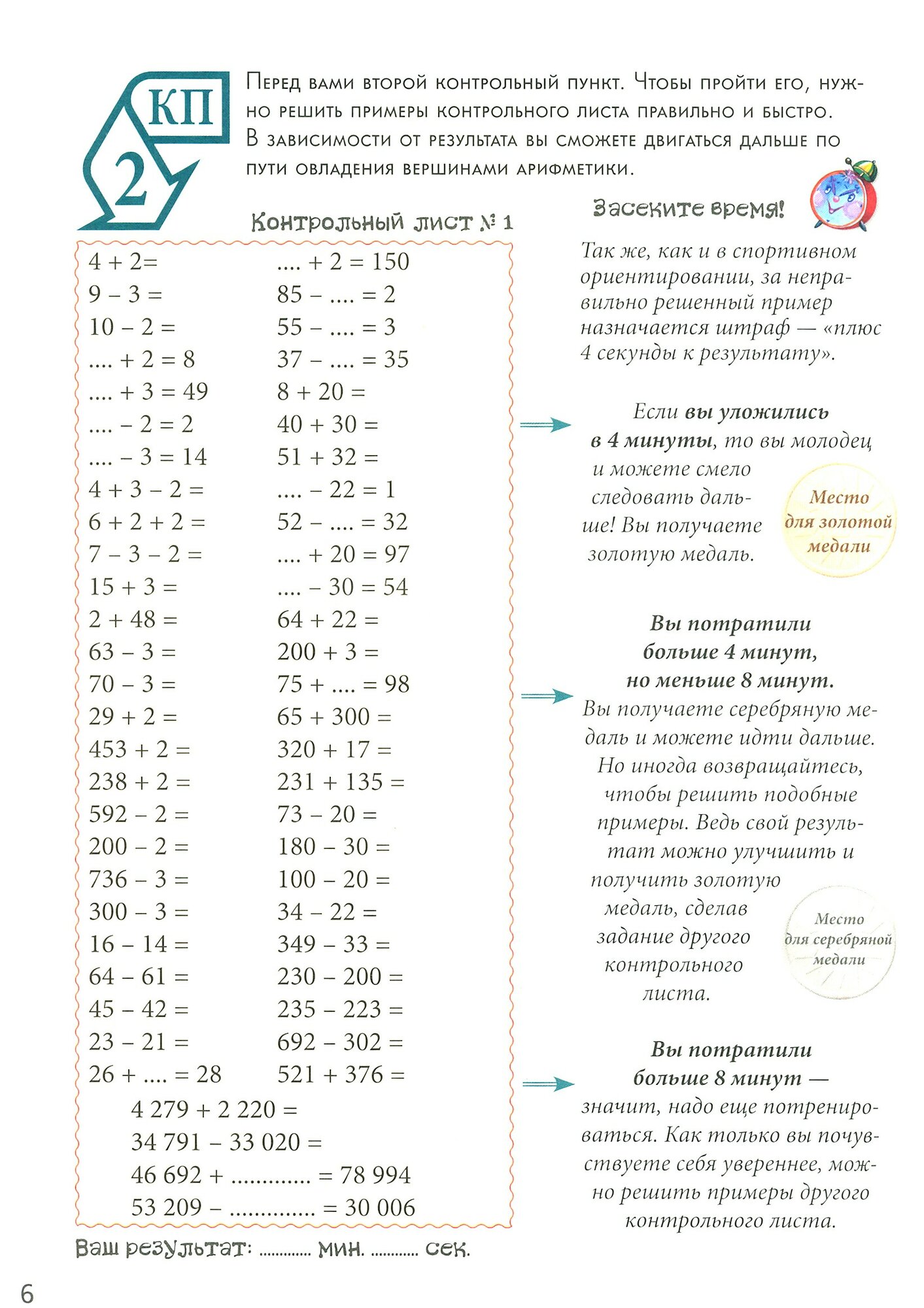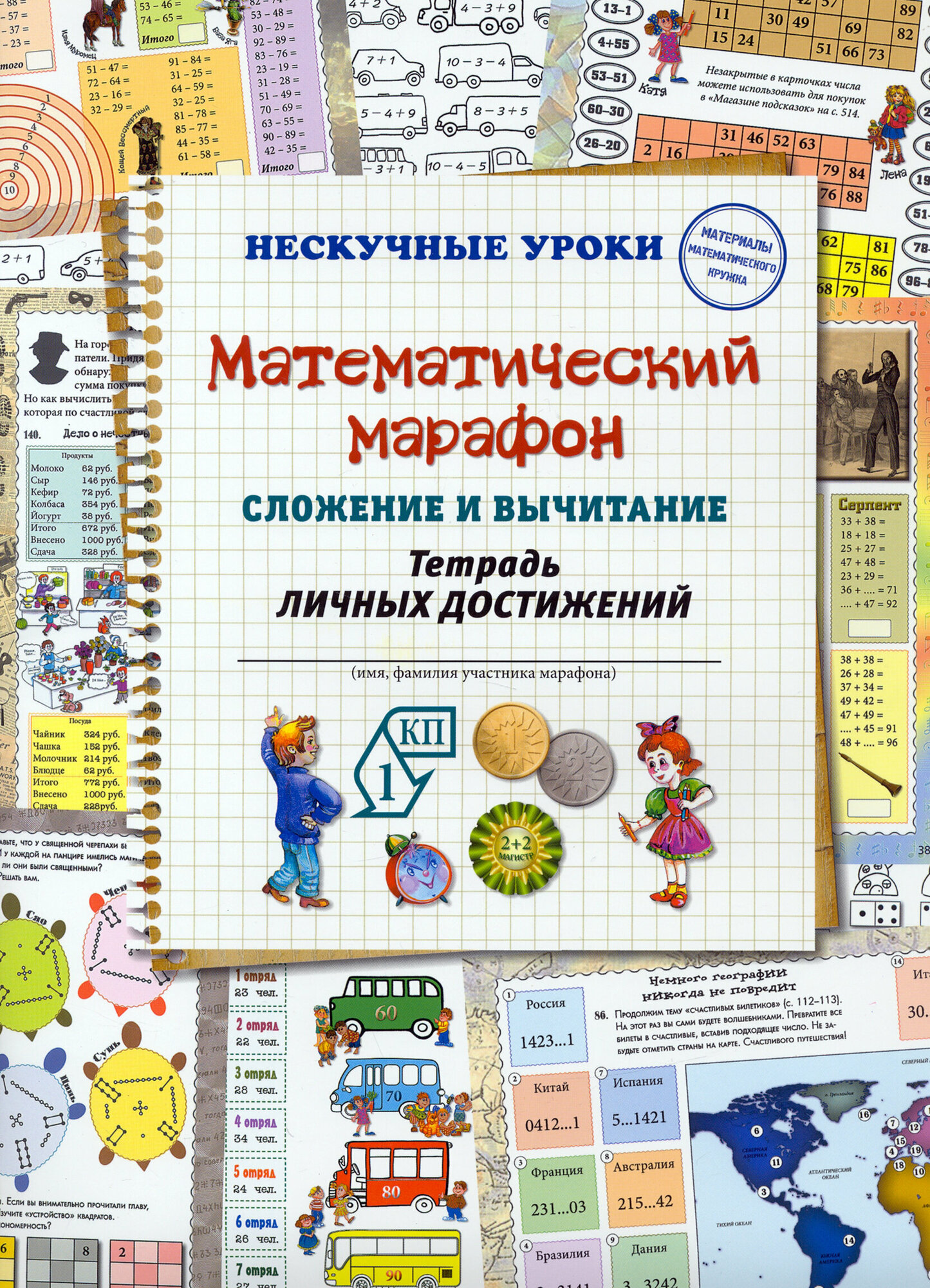 В "Тетради личных достижений" собраны и структурированы по сложности математические примеры. Пройдя все девять КП (контрольных пунктов) и получив медали, вы сможете с уверенностью сказать: ребенок прошел свой Личный математический марафон.