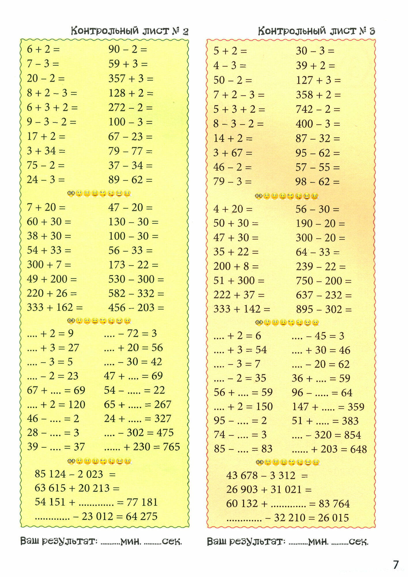 Тренажер предназначен для учеников 2-4 классов. Задание на каждом развороте направлено на отработку определенного типа примеров устного счета - от счета в пределах 10 до сложения и вычитания четырехзначных чисел.