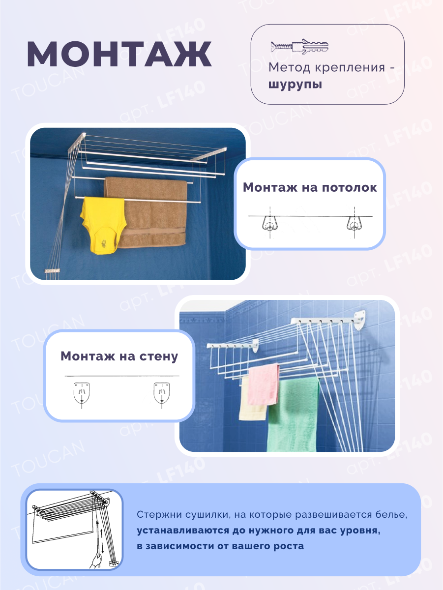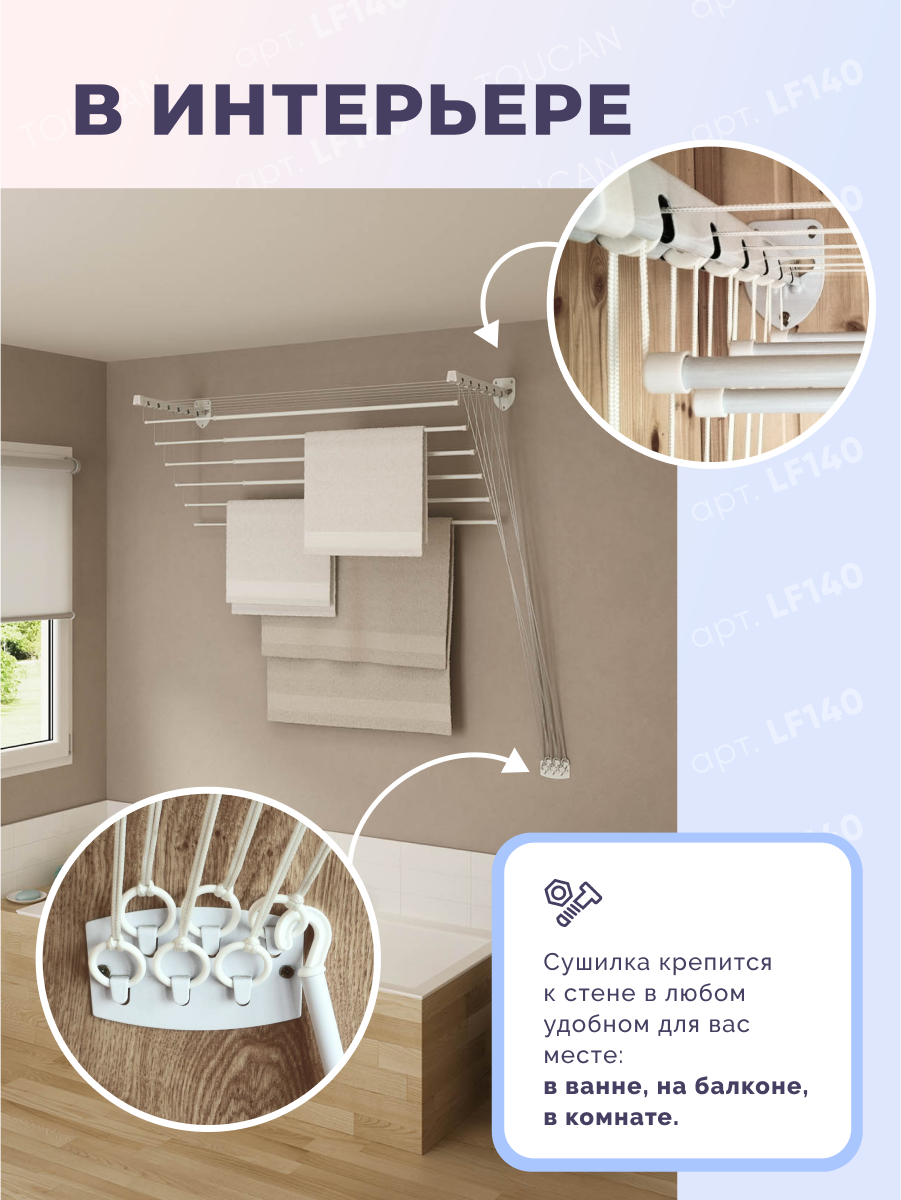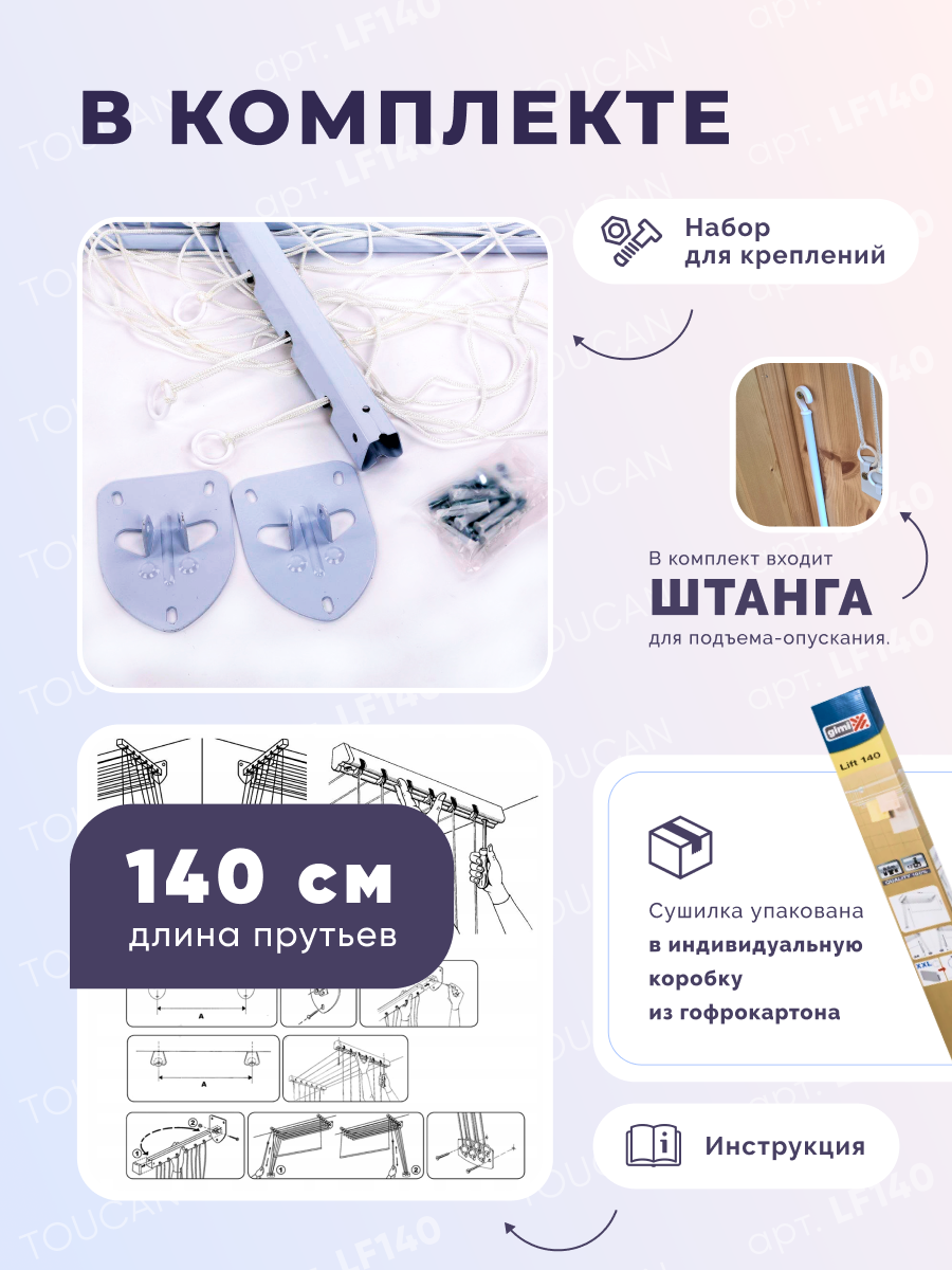 | Прочие особенности и свойства | Сушилка для белья "Lift 140", выполненная из стали, покрытой эпоксидным порошком, и пластика, имеет 6 текстильных струн длиной 140 сантиметров каждая, которые выдерживают до 15 кг белья. Специальный механизм обеспечивает подъем и опускание направляющих, чтобы облегчить процесс развешивания белья. Сушилка имеет складной механизм, благодаря которому она не займет много места. ,Сушилка "Lift 140" крепится к стене в любом удобном для вас месте:в ванне, на балконе, в комнате. |