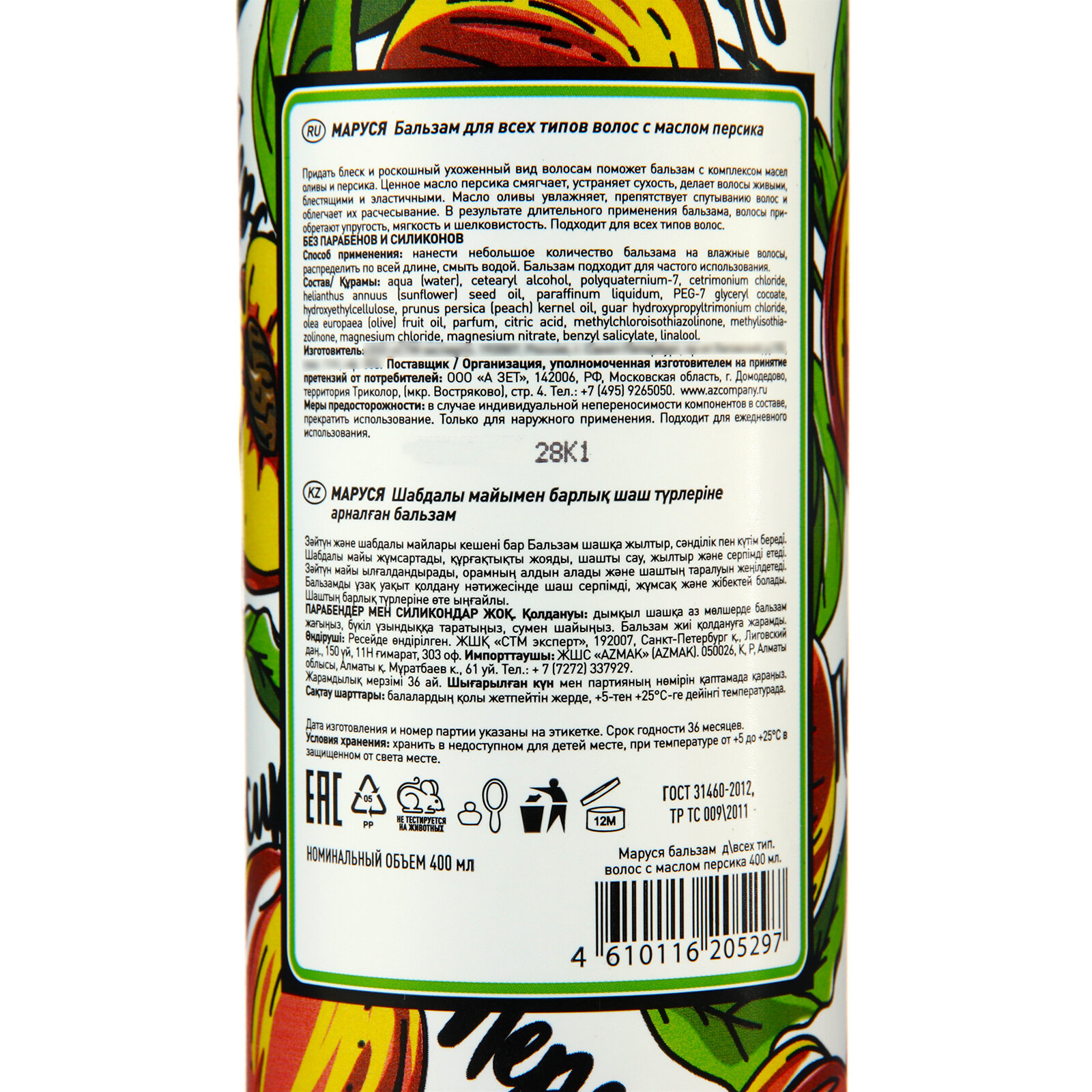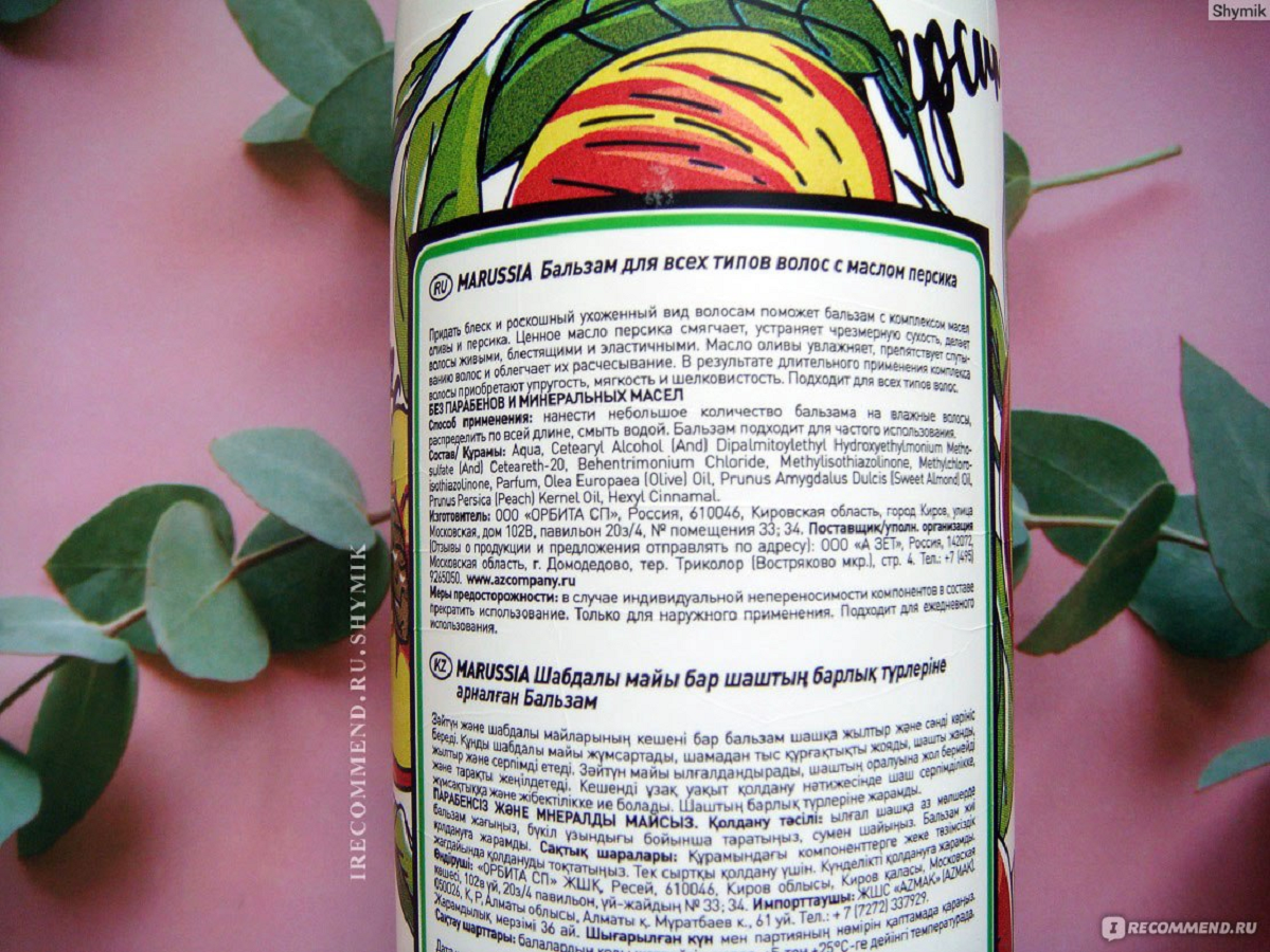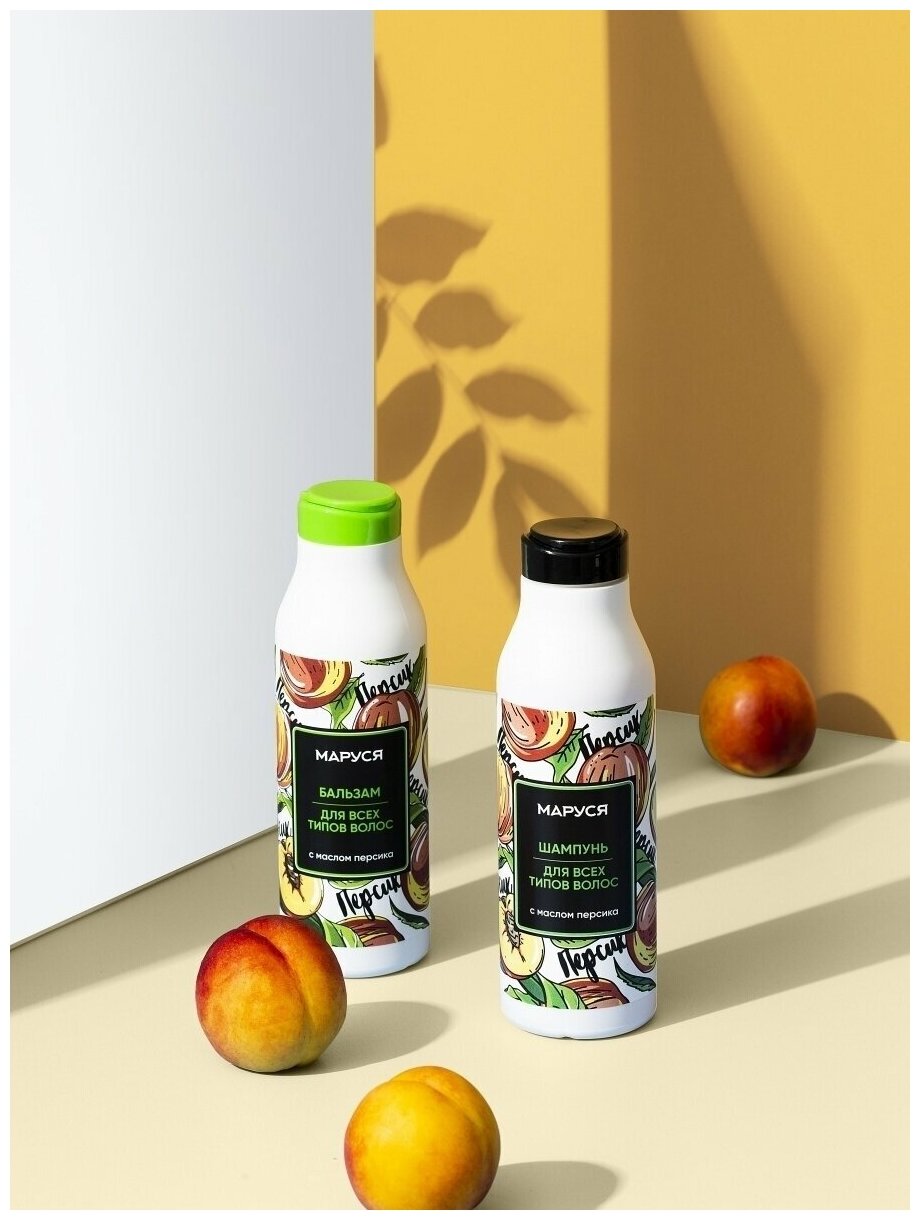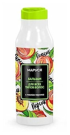 Marussia Бальзам для всех типов волос с маслом персика 400 мл маруся Бальзам для всех типов волос с маслом персика 400 мл. Придать блеск и роскошный ухоженный вид волосам поможет бальзам с комплексом масел оливы и персика. Ценное масло персика смягчает, устраняет сухость, делает волосы живыми, блестящими и эластичными. Масло оливы увлажняет, препятствует спутыванию волос и облегчает их расчесывание. В результате длительного применения бальзама волосы приобретают упругость, мягкость и шелковистость. Подходит для всех типов волос. Без парабенов и силиконов Способ применения: нанести небольшое количество бальзама на влажные волосы, распределить по всей длине, смыть водой. Бальзам подходит для частого использования. Состав: Аqua (water), cetearyl alcohol, polyquaternium-7, сetrimonium сhloride, helianthus annuus (sunflower) seed oil, paraffinum liquidum, PEG-7 glyceryl cocoate, hydroxyethylcellulose, prunus persica (peach) kernel oil, guar hydroxypropyltrimonium chloride, olea europaea (olive) fruit oil, parfum, citric acid, methylchloroisothiazolinone, methylisothiazolinone, magnesium chloride, magnesium nitrate, benzyl salicylate, linalool.