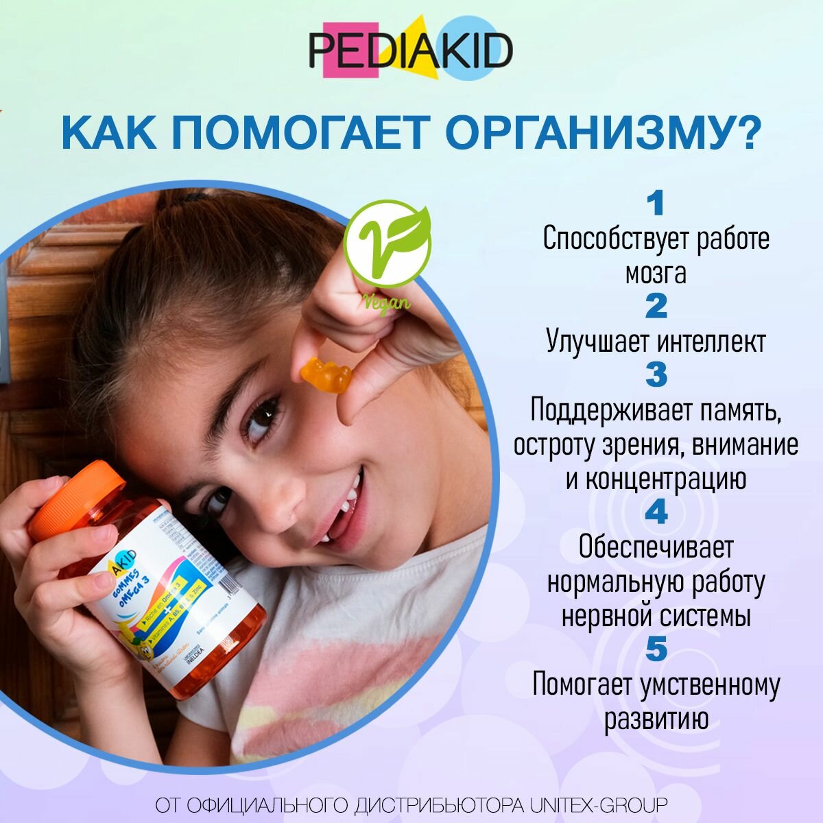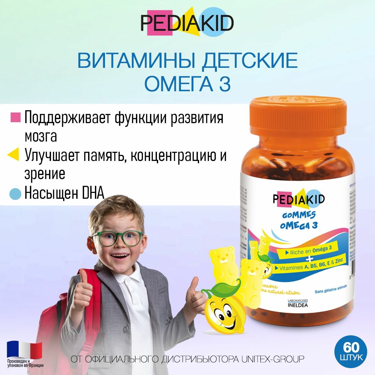 Добавка к пище в виде жевательных мишек-мармеладок на основе Омега 3 содержит витамины и цинк.Первые годы жизни имеют решающее значение для развития мозга ребенка: именно в этот период дети учатся и развиваются намного быстрее. Большие объемы знаний, особенно во время учебного года, требуют высокой интеллектуальной активности, для поддержания концентрации бред Pediakid разработал Жевательный мармелад Омега 3 / Pediakid Gommes Omega 3, который поддерживает рост организма и развитие мозга, а также когнитивные функции: концентрацию, внимание, зрение, память… Улучшает синтез нейротрансмиттеров (нейромедиаторов) и повышает интеллектуальную деятельность. На основе льняного масла, богатого Омега-3, такой как альфа-линоленовая кислота, незаменимая жирная кислота. В отличие от рыбьего жира, льняное масло не имеет не приятного вкуса. Богат витаминами Е, В5, В6, А и цинком. Жевательный мармелад Омега 3 / Pediakid Gommes Omega 3, созданный в форме игрушек – жевательных мультивитаминов, очень нравятся детям и их родителям. Для наилучшего усвоения не содержит искусственных ароматизаторов и красителей, также не содержит глютен и лактозу.Противопоказания: индивидуальная непереносимость компонентов, беременность, кормление грудью, нарушение углеводного обмена.