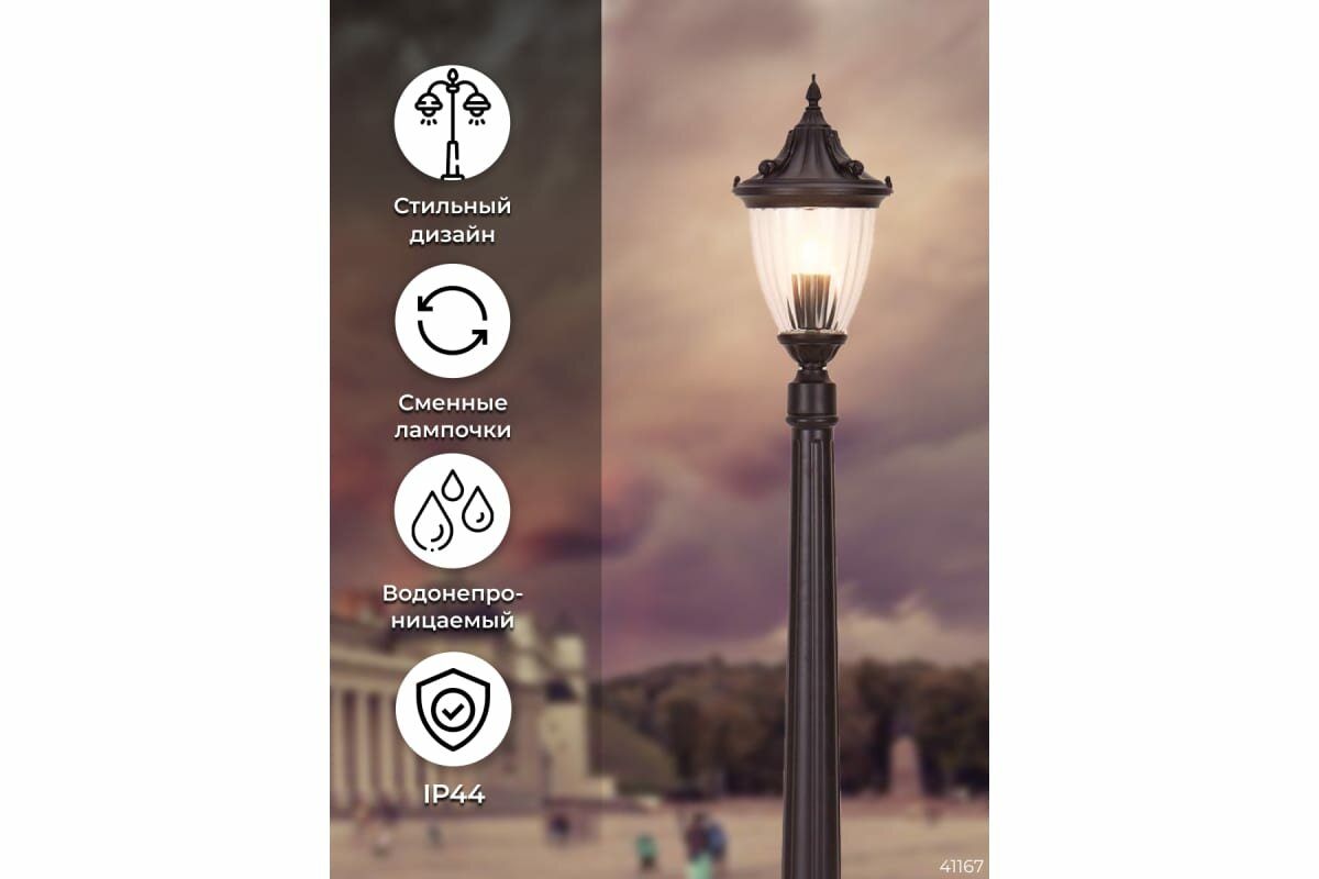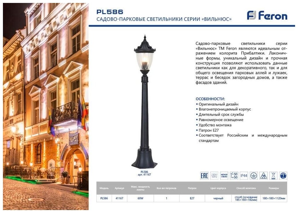 Наземный фонарь Вильнюс 41167 IP44 - продукт известной компании Feron (Китай). Имеет максимальную мощность 60 Вт, освещает площадь до 3 кв. м. Отлично подойдет для таких мест, как сад. Впишется в интерьеры следующих стилей: классический.