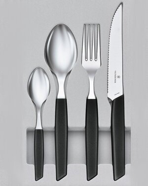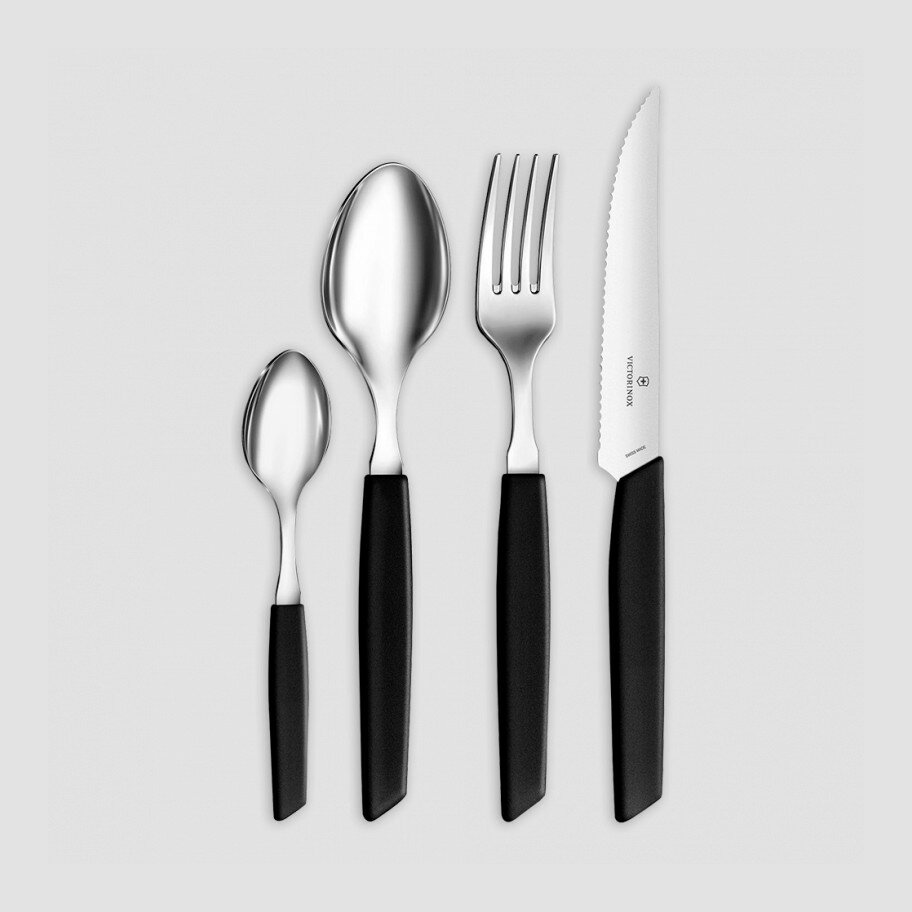 Набор столовых принадлежностей Victorinox Swiss Modern: 6 ножей для стейка, 6 вилок, 12 ложек. Серия Swiss Modern Extension привнесёт сдержанную элегантность на вашу кухню. Этот изысканный ассортимент столовых приборов изготовлен из прочной нержавеющей стали, пригодной для мытья в посудомоечной машине. Новые яркие тона и минималистичный чёрный цвет ручек с противоскользящим покрытием придают коллекции современную модную эстетику. Лезвия ножей сверхострые и предназначены для легкого нарезания, в то время как остальная часть ассортимента идеально подходит для непринужденной трапезы, которую можно разделить с семьей и друзьями. Ключевые особенности: Современные столовые приборы для ежедневных трапез Все ножи оснащены острым лезвием с волнистой кромкой Изготовлены из нержавеющей стали, с синтетическими ручками современной формы Характеристики: Материал рукояти: сополимер полипропилена. Тип металла: нержавеющая сталь. Упаковка: складная картонная коробка. Пригодность для мытья в посудомоечной машине: да. В комплек