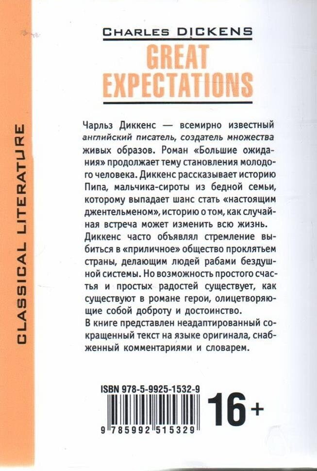 Чарльз Диккенс — всемирно известный английский писатель, создатель множества живых образов. Роман «Большие ожидания» продолжает тему становления молодого человека. Диккенс рассказывает историю Пипа, мальчика-сироты из бедной семьи, которому выпадает шанс стать «настоящим джентльменом», историю о том, как случайная встреча может изменить всю жизнь. Диккенс часто объявлял стремление выбиться в «приличное» общество проклятьем страны, делающим людей рабами бездушной системы. Но возможность простого счастья и простых радостей существует, как существуют в романе герои, олицетворяющие собой доброту и достоинство.