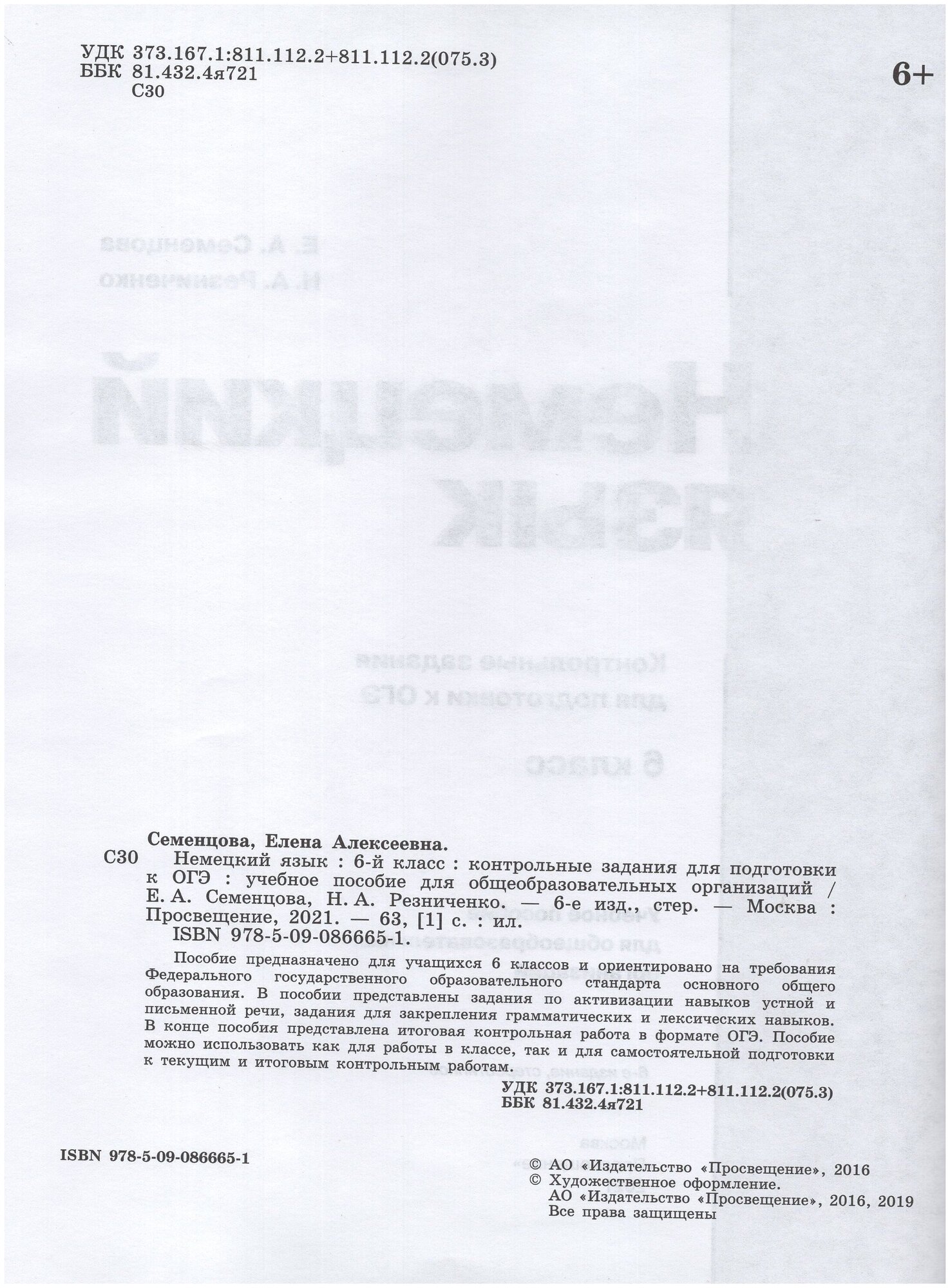 Учебное пособие «Немецкий язык. Контрольные задания для подготовки к ОГЭ. 6 класс» авторов Е. А. Семенцовой, Н. А. Резниченко предназначено для учащихся 6 классов и ориентировано на требования Федерального государственного образовательного стандарта основного общего образования. В пособии представлены задания по контролю сформированности у учащихся навыков чтения, письма и говорения и итоговая контрольная работа в формате ОГЭ. Пособие можно использовать как для работы в классе, так и для самостоятельной подготовки к текущим и итоговым контрольным работам. В комплект входят: рабочая программа, учебник в 2-х частях, рабочая тетрадь, книга для учителя, контрольные задания для подготовки к ОГЭ, книга для чтения для 5–6 и 7–9 классов, сборник упражнений по грамматике для 5–9 классов, аудиокурс (mp3), электронная форма учебника.