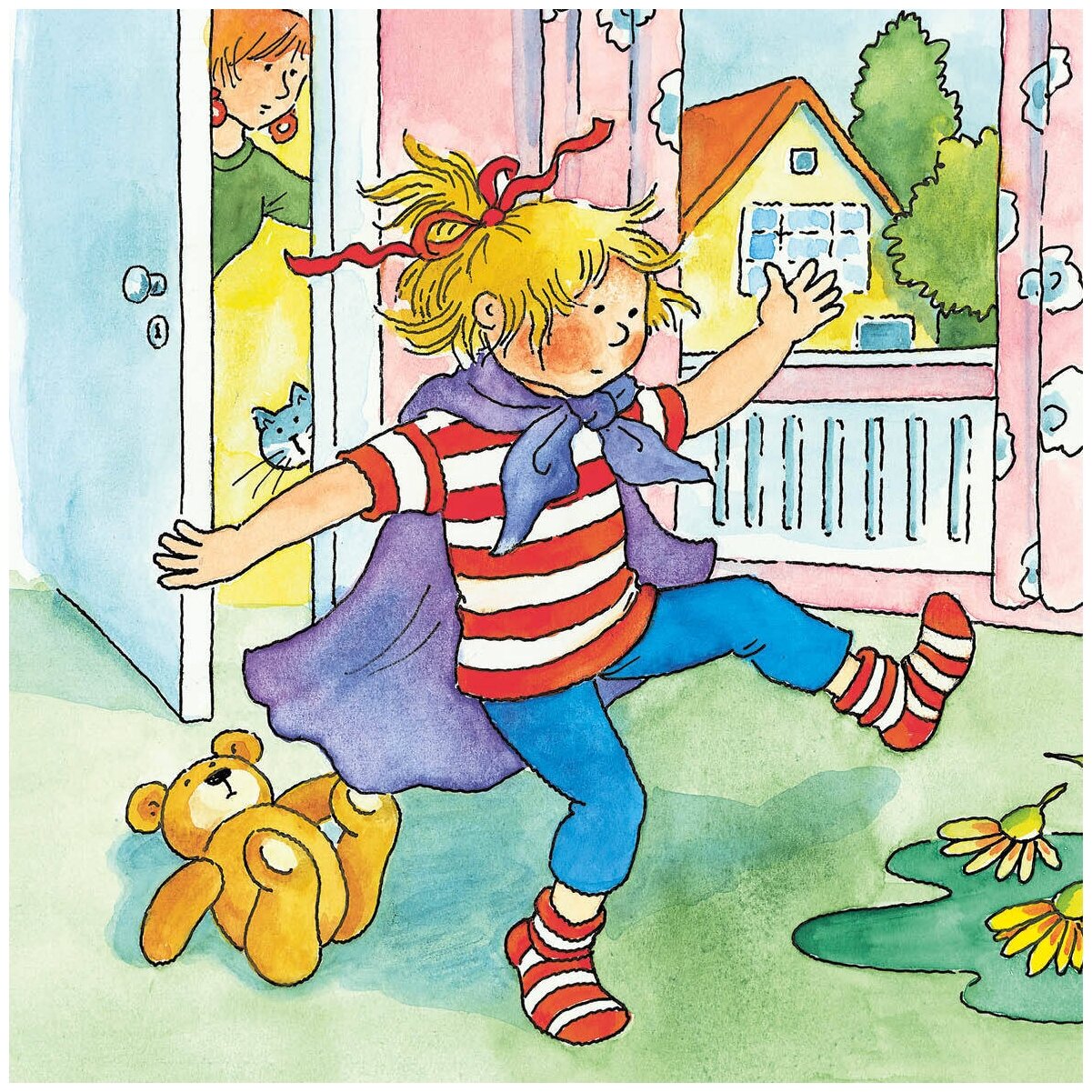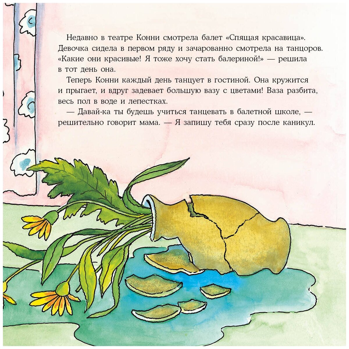 Теперь Конни каждый день танцует в гостиной. Она кружится и прыгает, и вдруг задевает большую вазу с цветами! Ваза разбита, весь пол в воде и лепестках.