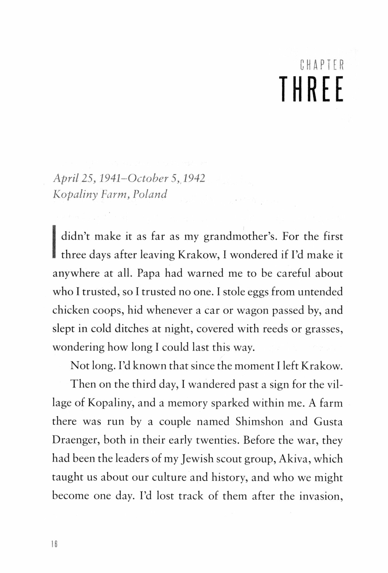 Chaya Lindner is a teenager living in Nazi-occupied Poland. Simply being Jewish places her in danger of being killed or sent to the camps. After her little sister is taken away, her younger brother disappears, and her parents all but give up hope, Chaya is determined to make a difference. Using forged papers and her fair features, Chaya becomes a courier and travels between the Jewish ghettos of Poland, smuggling food, papers, and even people.