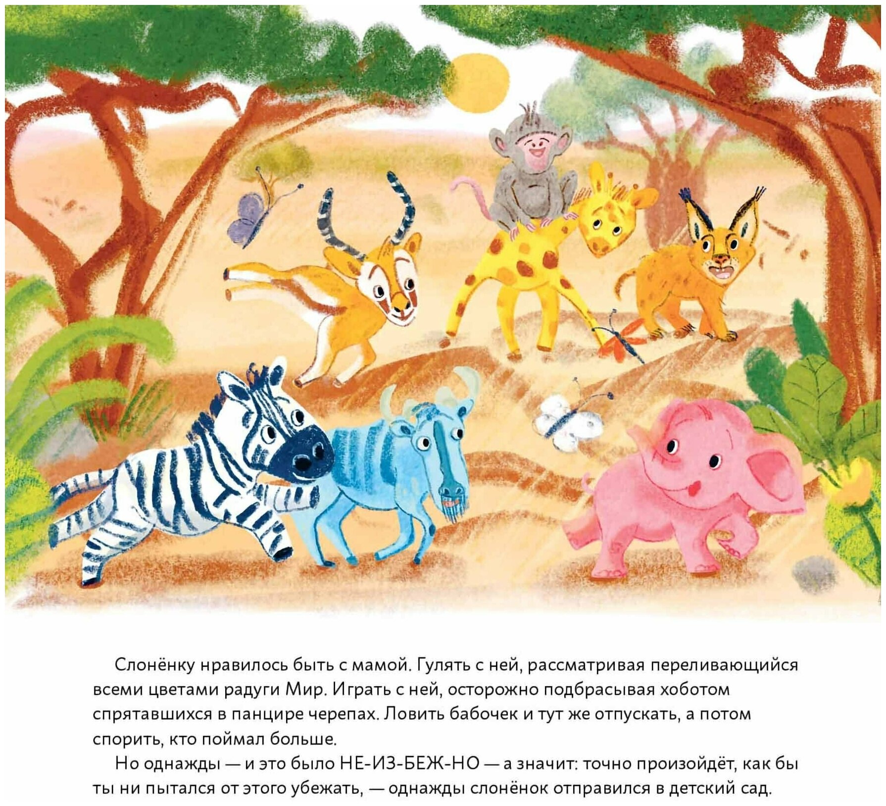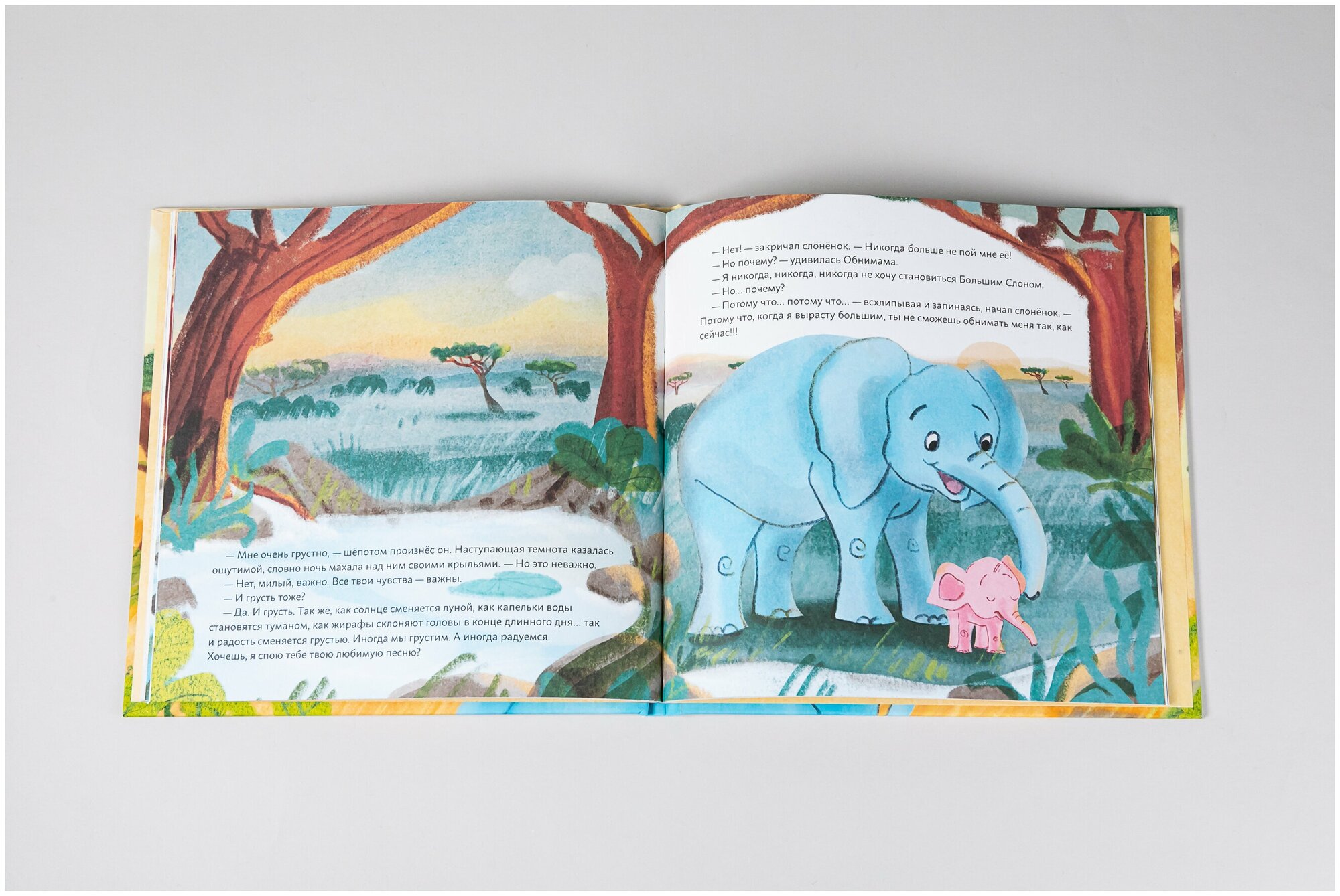 Слонёнок Обнимашка живет в саванне, ходит в детский сад и больше всего на свете любит обниматься с мамой. Однажды в детском саду появляется новенький – волчонок Зо – и начинает высмеивать Обнимашку. Но ведь слонёнок не сделал ему ничего плохого! Как же поступить?..