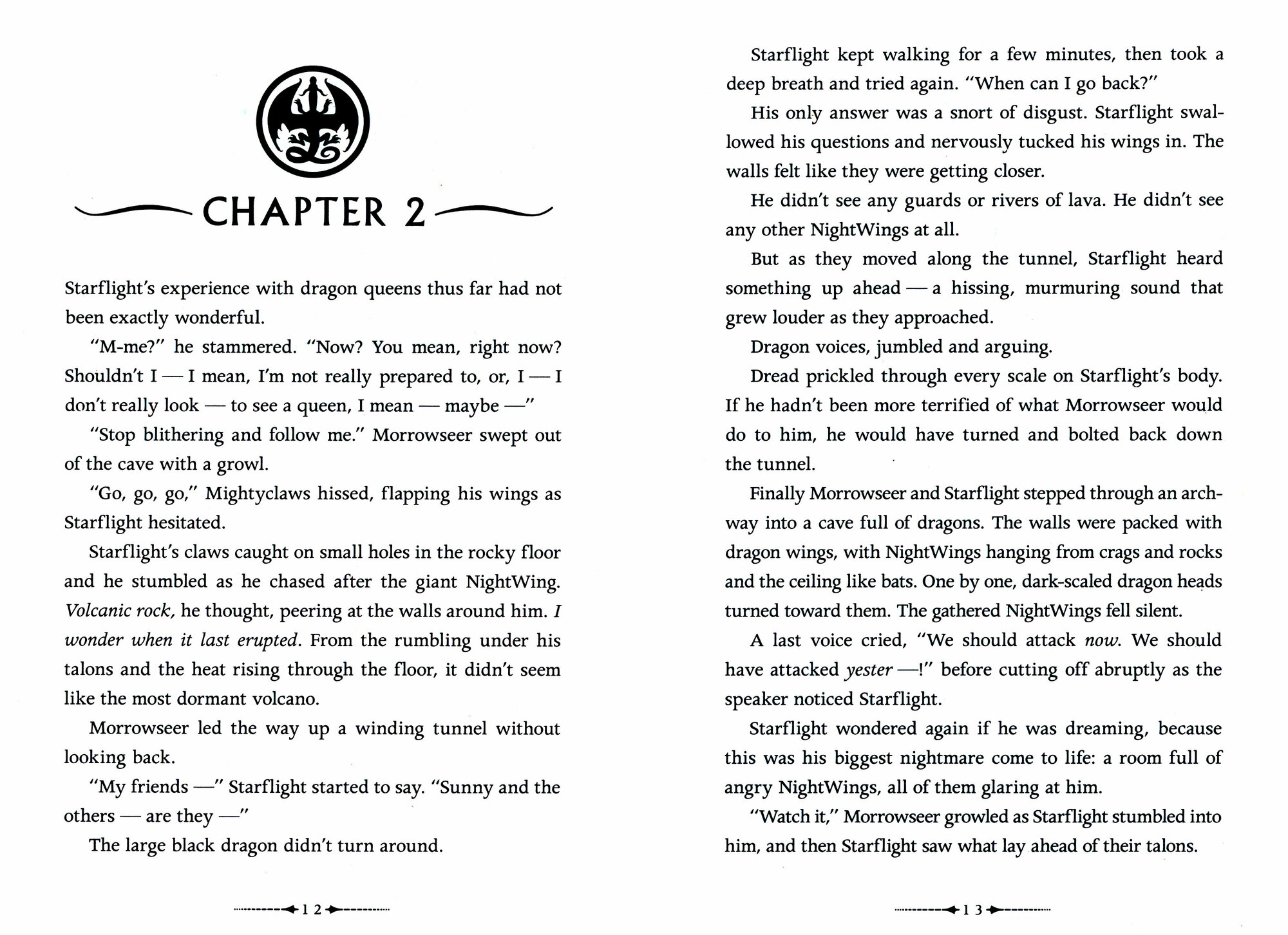 In the shadows, trouble is brewing. . .The mysterious NightWings keep everything hidden, from their home and their queen to their allegiance in the war. Now they've kidnapped their own dragonet of destiny, and Starflight is finally meeting the rest of his tribe - whether he wants to or not. The NightWings have also kidnapped several innocent RainWings, now trapped in the dark, barren, miserable place that is the NightWing kingdom. Starflight wants to help the RainWings, but he's busy saving his own scales and trying to find a way back to his friends. The fate of two kingdoms rests in his talons, and with no one to save him, Starflight will have to find a way to be brave . . . before it's too late.