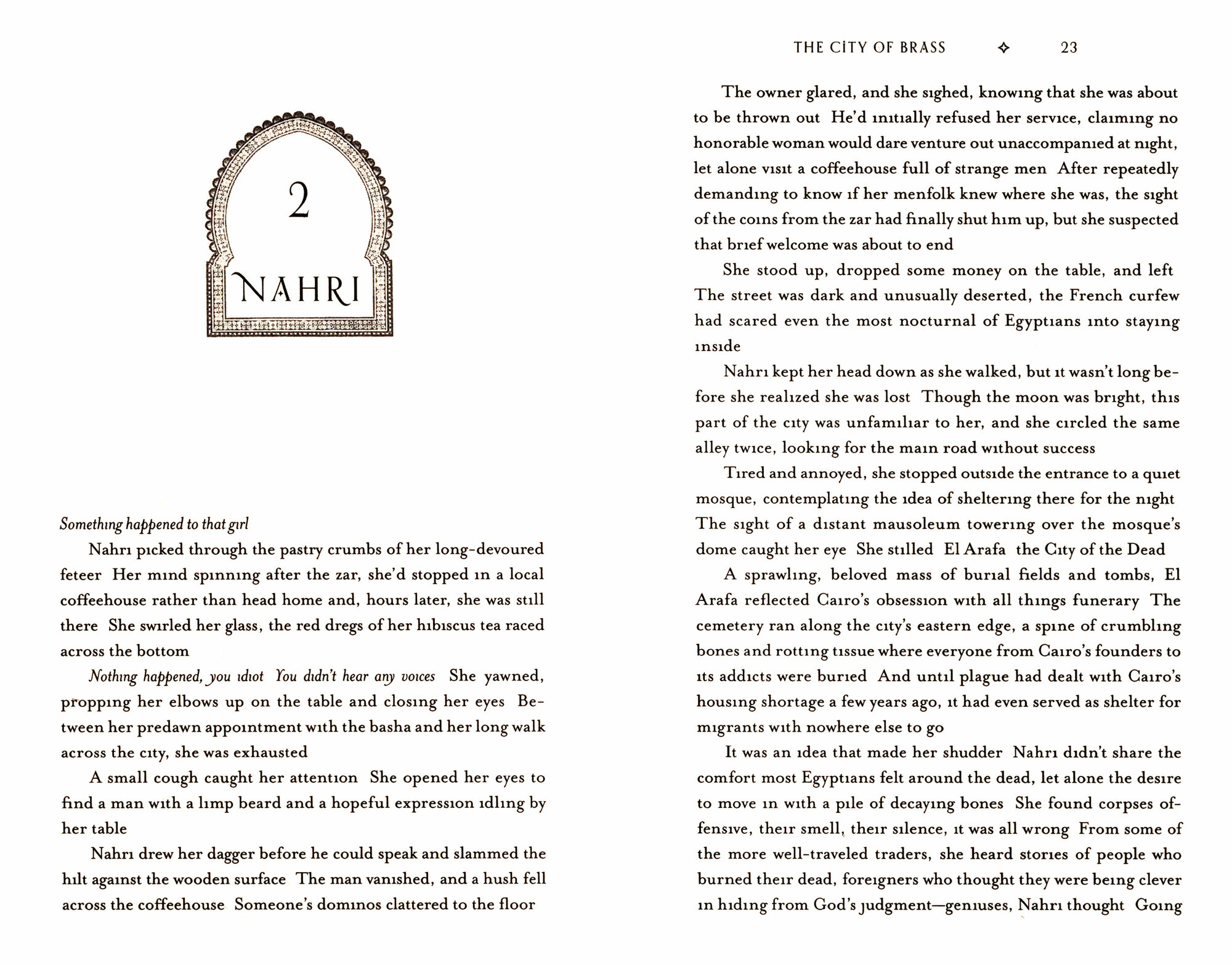 Many wish their lives could be filled with such wonder, but not Nahri. She knows the trades she uses to get by are just tricks and sleights of hand: there’s nothing magical about them. She only wishes to one day leave Cairo, but as the saying goes…