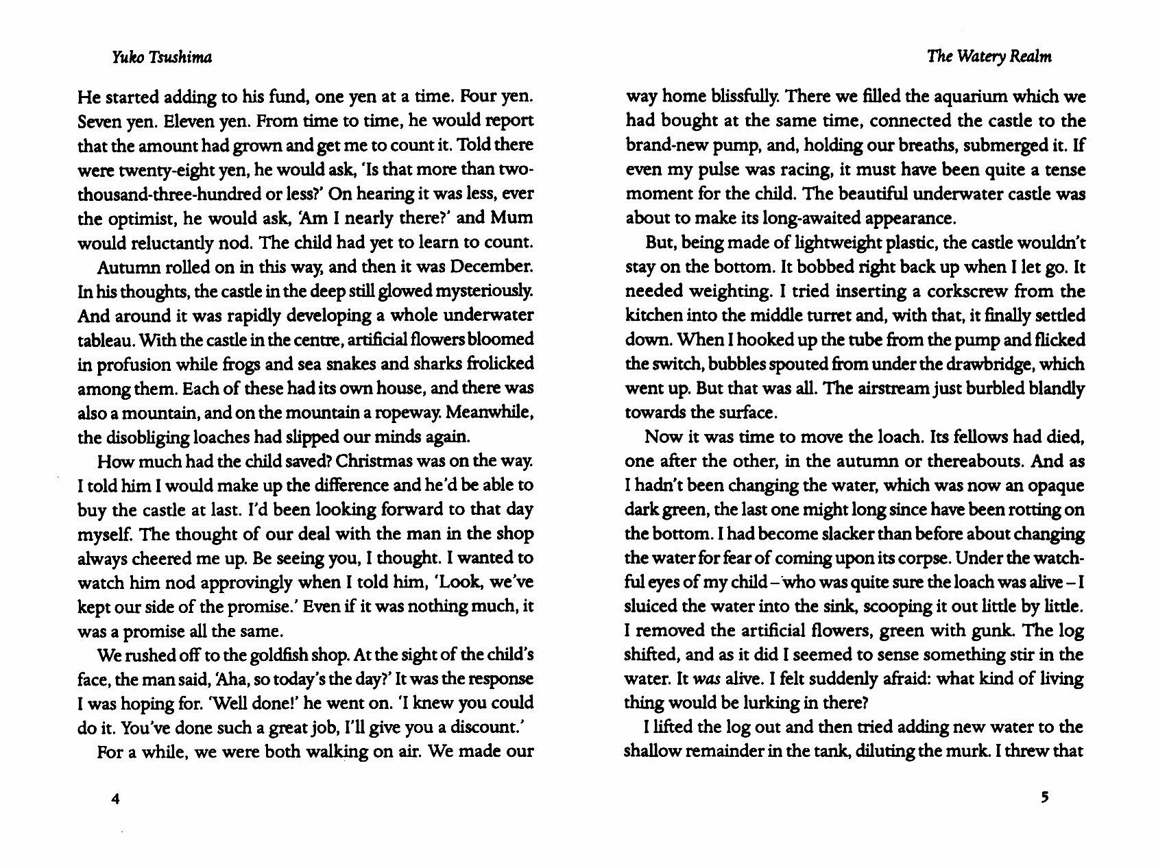 Этот сборник состоит из двух рассказов: «Водное царство» и «О собаках и стенах». Первая была опубликована в 1982 году, а вторая - в 2014 году, и это первый раз, когда обе сказки были переведены на английский язык Джеральдиной Харкорт. «Водное царство» начинается довольно интригующе: «Насколько я помню, в середине лета, когда ему исполнилось пять лет, мой сын обнаружил замок в западном стиле в витрине магазина золотых рыбок в нашем районе». Я нашла эту историю увлекательной и реалистичной. К сожалению, мне не так сильно понравился «О собаках и стенах». Хотя в целом обе истории были интересны и заставляли меня гадать, ни одна из них не была слишком неясной, я не чувствую вдохновения читать остальную часть работы Цусимы.Я нахожу японскую художественную литературу не близкой моему русскому духу, она проходит мимо меня.