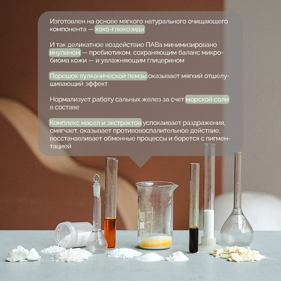Средство для глубокого очищения не на каждый день. Комплекс масел и экстрактов успокаивает раздражения, смягчает, оказывает противовоспалительное действие, восстанавливает обменные процессы и борется с пигментацией. Благодаря содержанию морской соли нормализует работу сальных желез. Порошок вулканической пемзы действует как мягкий пилинг, стимулирует обновление кожи и выравнивает ее рельеф. Эфирные масла мяты, лимона и иланг-иланга приятно освежают и повышают тонус. Уровень pH 5,0.