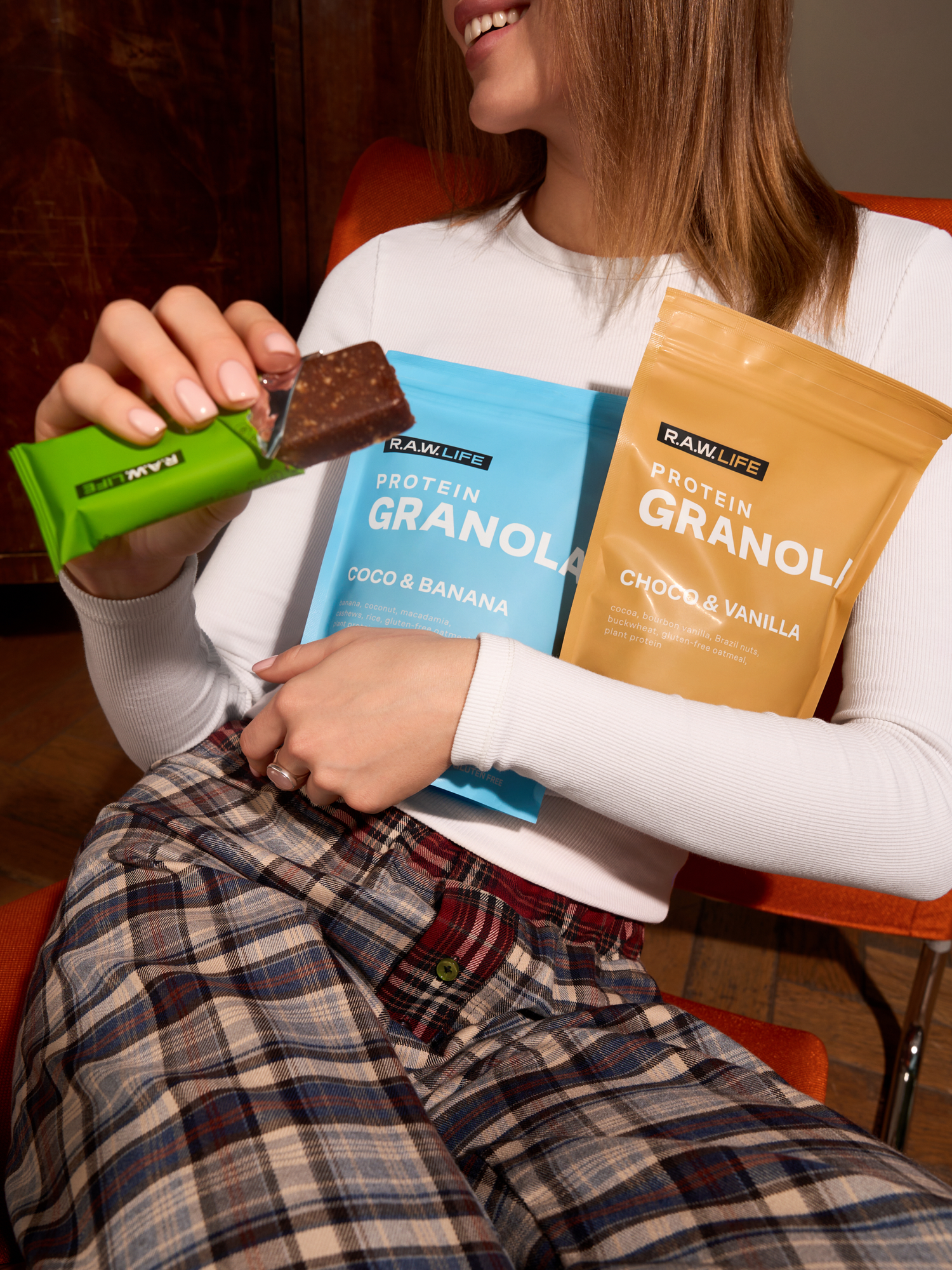 | Состав | Хлопья овсяные без содержания глютена, концентрированный сок винограда, миндаль, кокосовое масло, изюм, смесь протеинов (гороховый белок, белок из семян чиа), взорванное зерно гречихи, инжир, кофе зерновой, корица, кардамон, соль розовая гималайская, витамин Е (смесь токоферолов) |