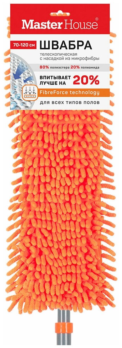 Швабра с телескопической ручкой длиной 70-120см. для пола с насадкой из микрофибры. С карманами. Поворотно-наклонный механизм, позволяет легко производить уборку в углах комнат, под шкафами, кроватями и диванами. Микрофибра притягивает и удерживает частицы пыли за счет безупречных электростатических свойств материала. Может быть использована для сухой и влажной уборки для различных материалов поверхности. Размер рамки 39,5*9 см, размер насадки с микрофибровой рабочей частью (шениль) 43*13 см. Состав (материал): металл, пластик, микрофибра (80% полиэстер, 20% полиамид)