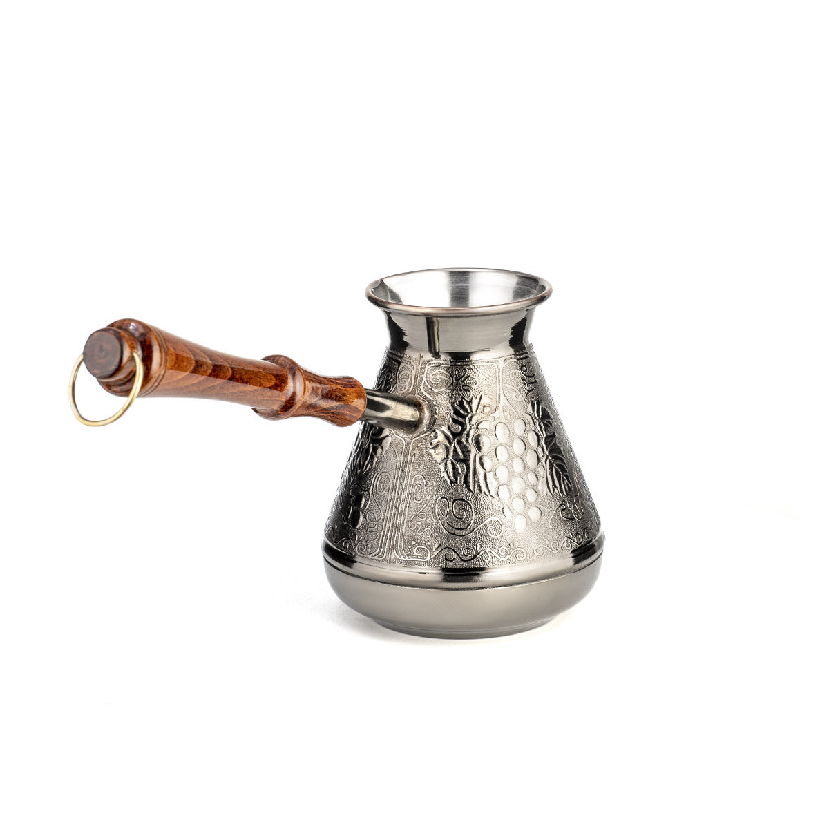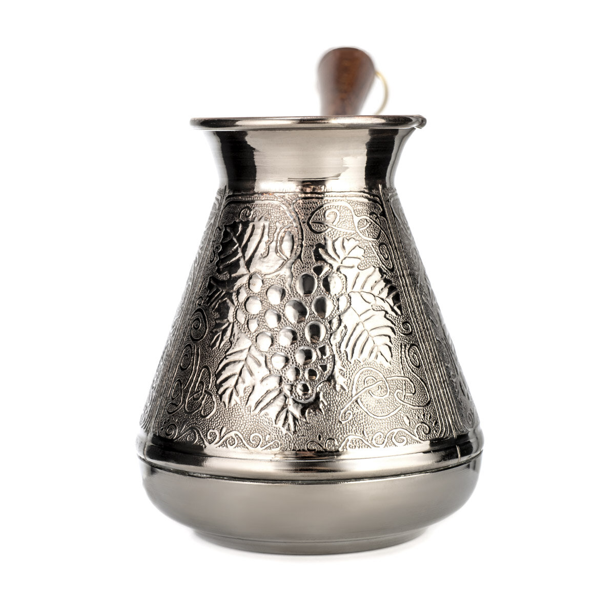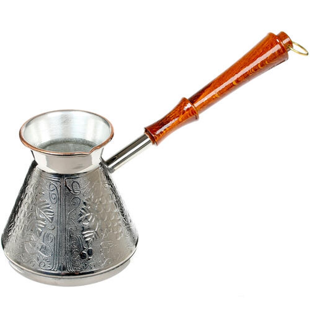 Как приятно выпить чашку свежего только что сваренного кофе. Подлинная находка для любителей настоящего ароматного напитка – турка LARA . Турка латунного цвета выполнена из высококачественной меди в аутентичном дизайне с изящным узором «Виноград». Произведено в России. Удобная лакированная ручка из натурального дерева не будет нагреваться при использовании, а металлическое кольцо позволит подвешивать турку и удобного хранить её. Узкое горлышко способствует наилучшему раскрытию вкуса. Подходит для приготовления натурального кофе на газовых и электрических плитах. Турка дополнит кухонный интерьер и подарит новый опыт в приготовлении кофе.