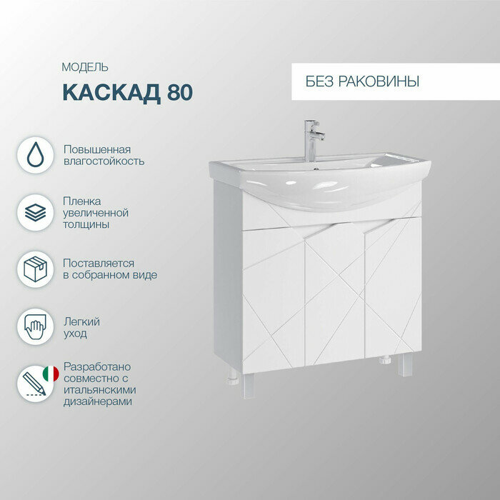Тумба напольная SanStar Каскад 80 Без раковины для ванной комнаты белая производится на российском заводе, оснащенном высокотехнологичным европейским оборудованием под брендом SanStar. Под контролем отдела качества, с соблюдением ТУ и ГОСТ. Линейка мебели Каскад, выполненная в современном стиле, внесет в Вашу ванную комнату неповторимый дизайн и обновление. Дополнительно к тумбе возможно приобрести полный комплект мебели Каскад, а именно зеркало или зеркальный шкаф, шкаф-пенал. Для изготовления корпуса используется влагостойкий ЛДСП - покрытие матовое, фасад изготавливается из МДФ. Для покрытия фасада изделия используется высококачественная глянцевая пленка увеличенной толщины. Петли с доводчиками Boyard. Количество полок, выполненных из ЛДСП, без учета корпуса мебели 2, из них 1, левая, съемная. Три дверцы с доводчиками, две из которых открывается вправо, а третья влево.