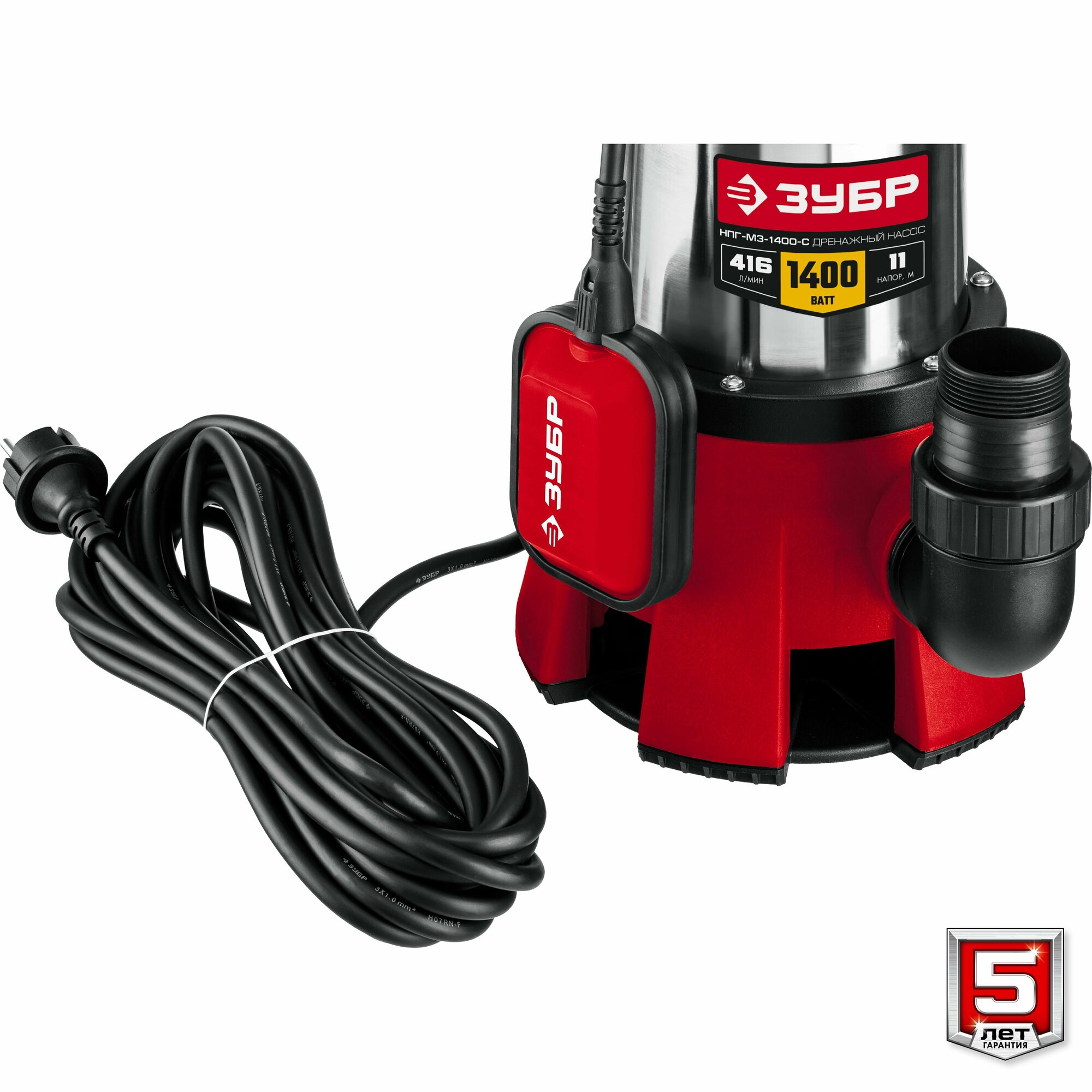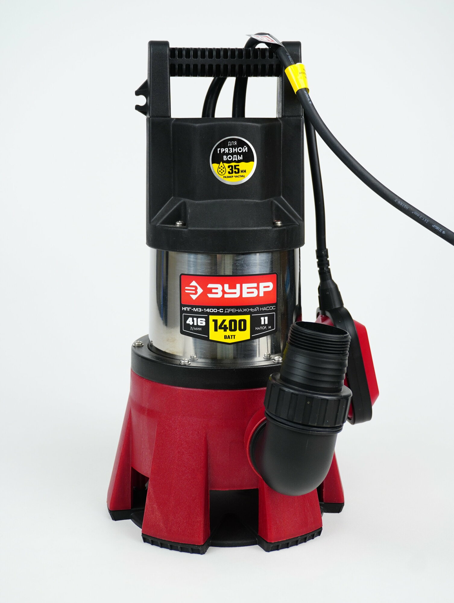 Дренажный насос для грязной воды Зубр НПГ-М3-1400-С, мощность 1400Вт, дренажный, погружной, производительность до 416л/ч, высота подачи до 11м, глубина погружения до 7м
