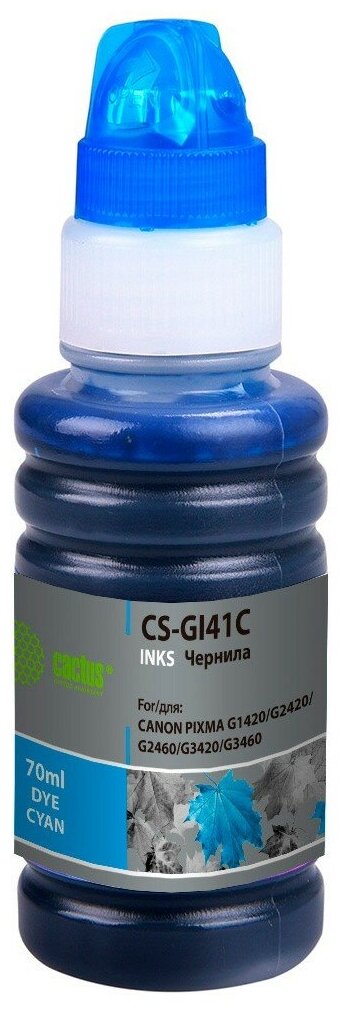 Чернила Cactus GI-41 C голубой, флаконов: 1, объём 70мл, для Canon PIXMA G1420/G2420/G2460/G3420/G3460