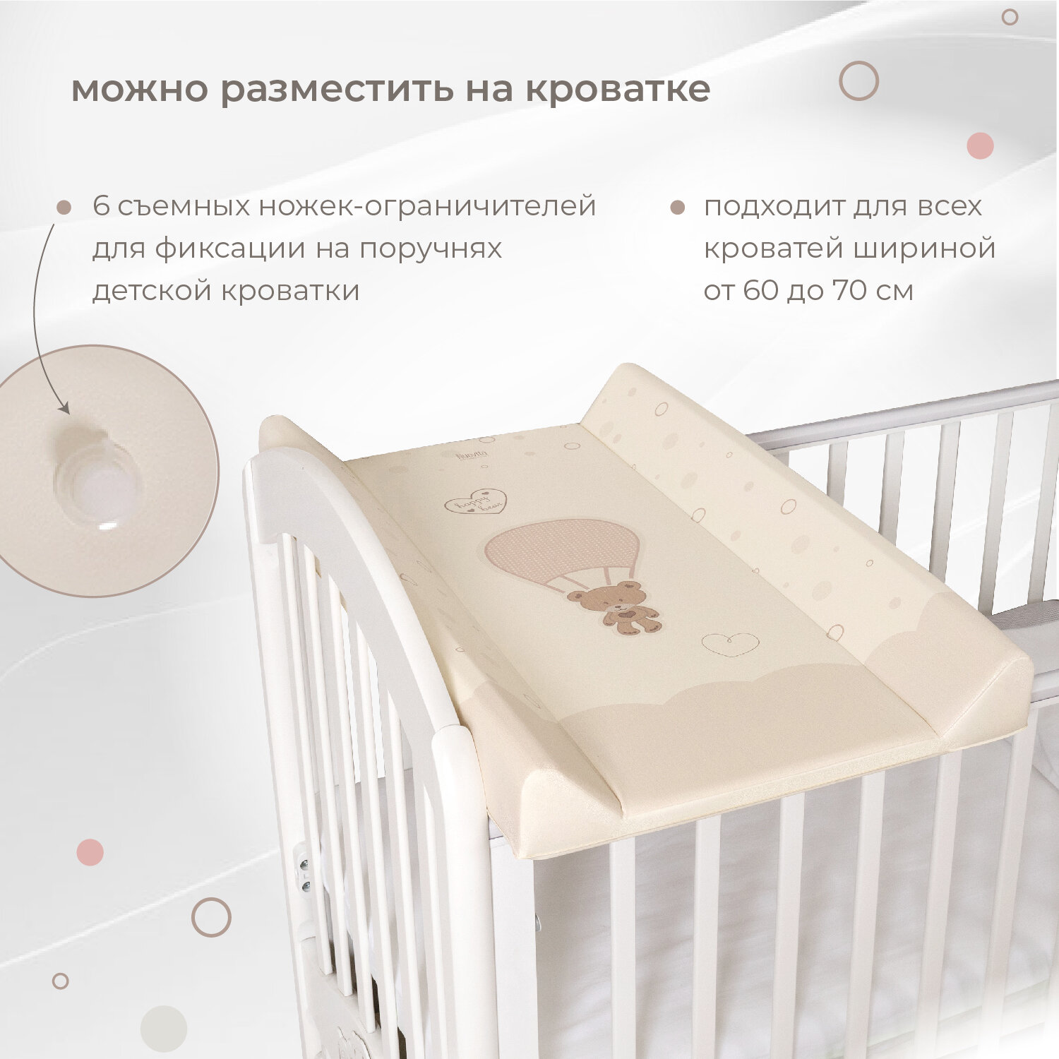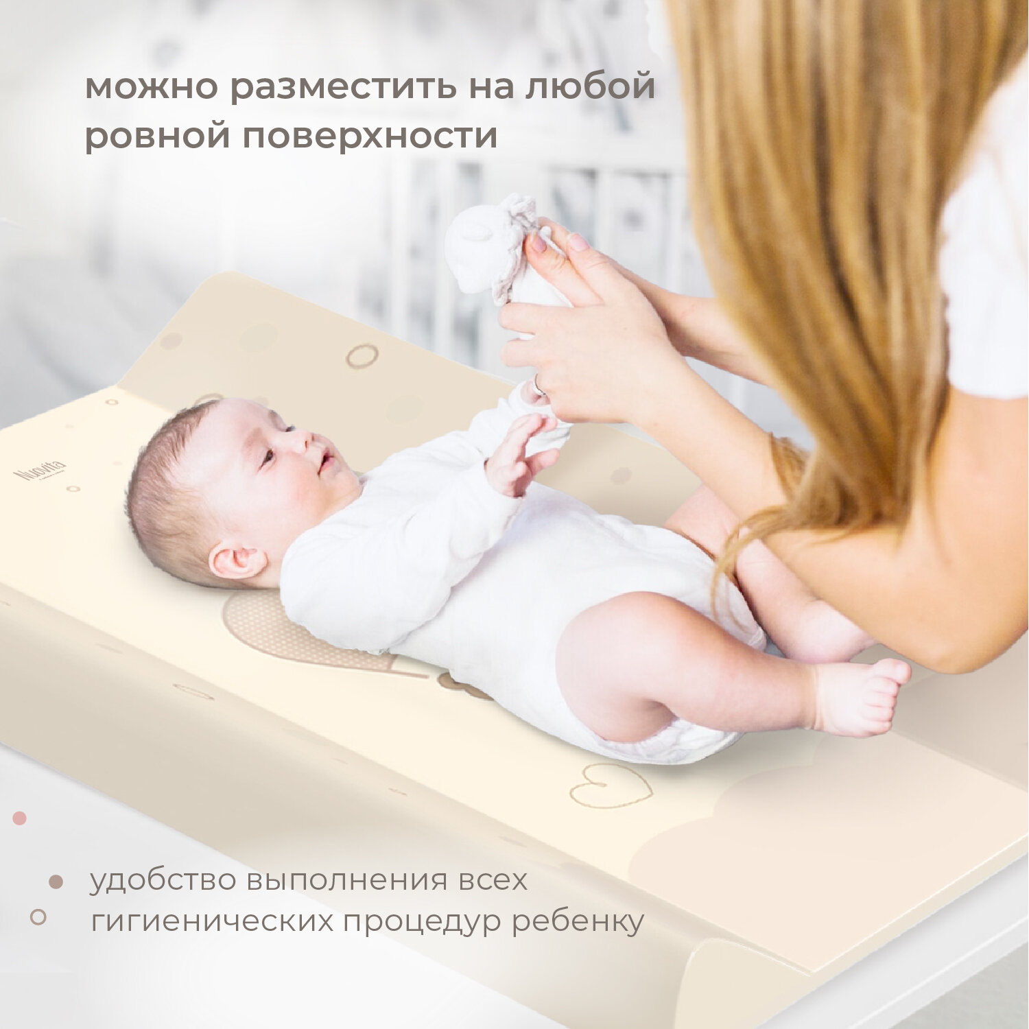 Пеленальная доска Nuovita (Нуовита) - это простое и надежное приспособление для ухода за новорожденным малышом (с рождения и до года), которое пригодится при отсутствии пеленального комода. Доска универсальна, ее можно разместить на любой ровной поверхности или зафиксировать на поручнях детской кроватки. Для этого в конструкции предусмотрены съемные ножки-ограничители (6 шт.), благодаря которым доска прочно устанавливается на кровать. Она подходит для всех кроватей шириной от 60 до 70 см и позволяет с макси