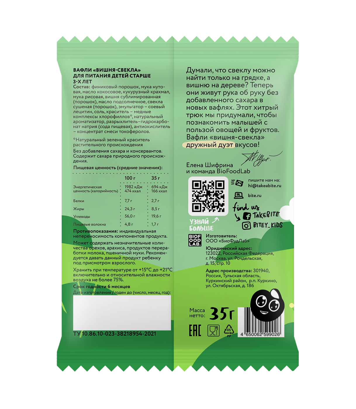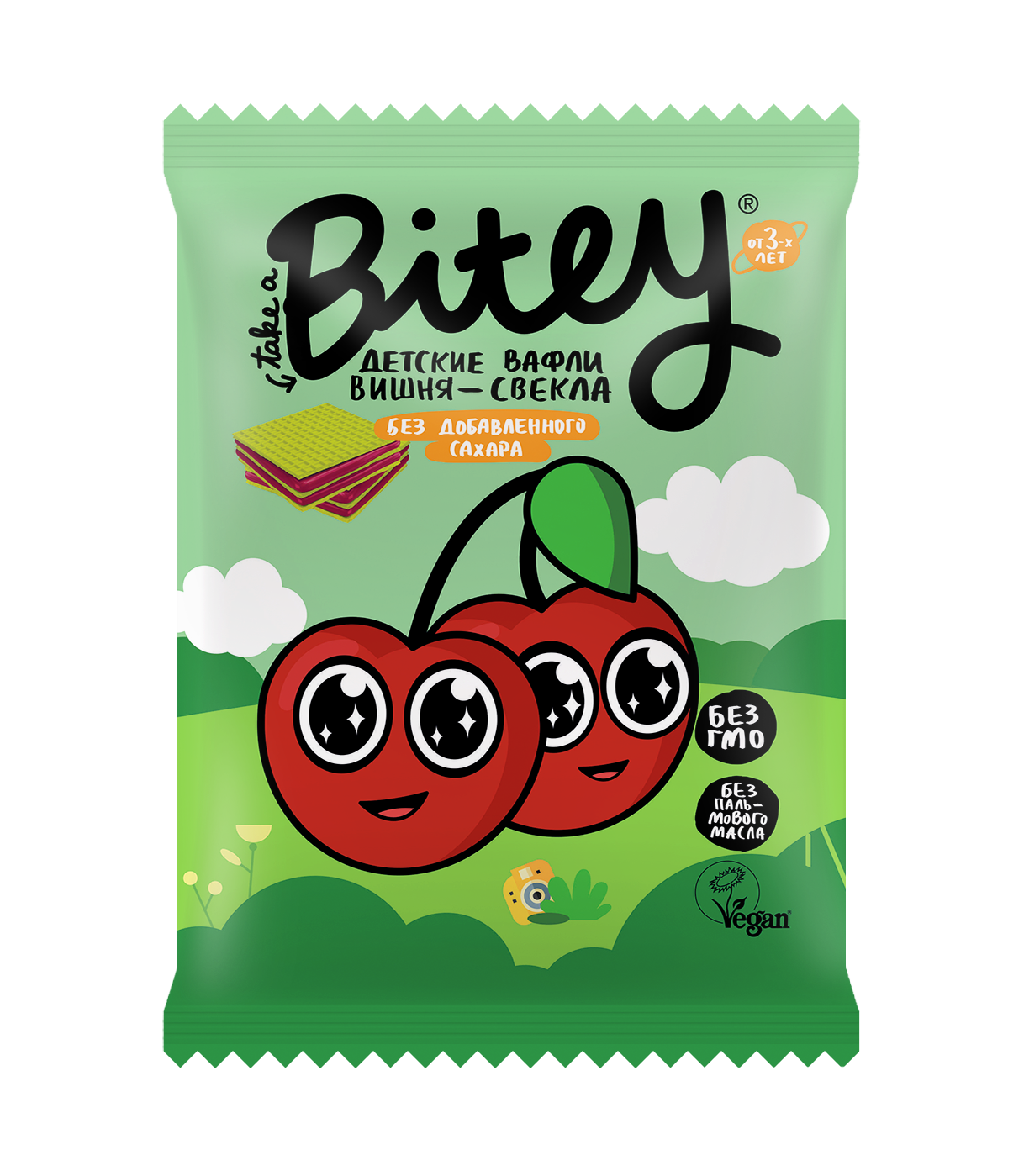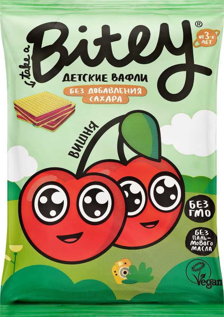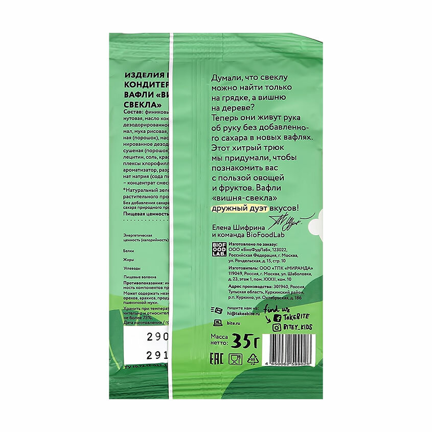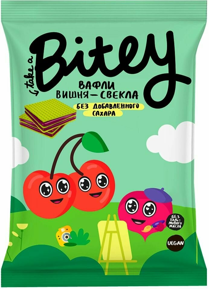 Вафли Bitey с вишней и свеклой - это вкусное и полезное лакомство для всей семьи. Продукт совсем не содержит добавленного сахара, консервантов и искусственных красителей. Зато в нем много натуральных фруктов и овощей, которые поддерживают иммунитет! А еще эти вафли невероятно красивого зеленого цвета! В качестве красителя мы используем настоящий суперфуд и кладезь полезных микроэлементов - 100% натуральный хлорофилл. Благодаря удобной упаковке вафли Bitey можно брать с собой на прогулку, в поездку или угоща