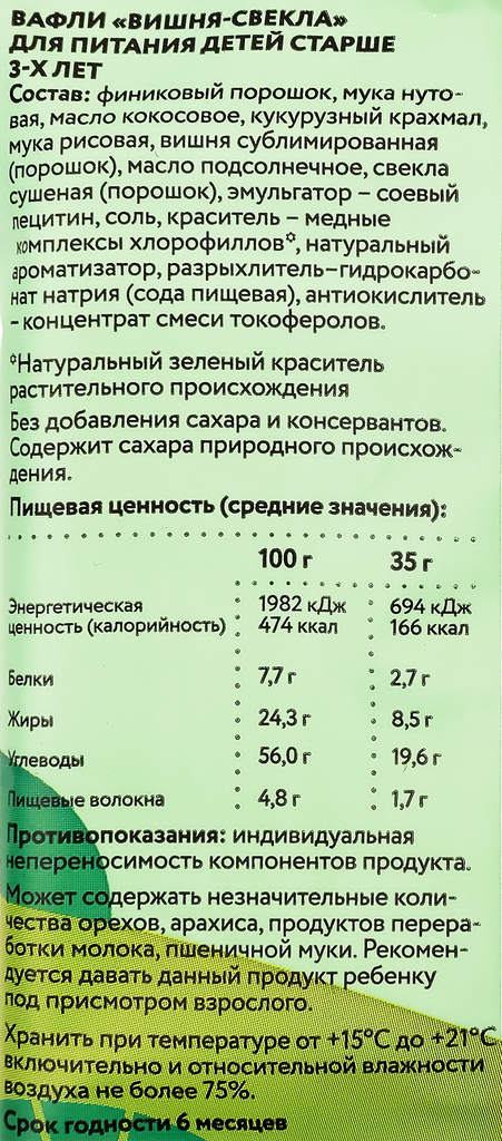 | Состав | Финиковый порошок, мука нутовая, масло кокосовое рафинированное дезодорированное, кукурузный крахмал, мука рисовая, вишня сублимированная (порошок), масло подсолнечное рафинированное дезодорированное, свекла сушеная (порошок), эмульгатор – соевый лецитин, соль, краситель – медные комплексы хлорофиллов*, натуральный ароматизатор, разрыхлитель – гидрокарбонат натрия (сода пищевая), антиокислитель – концентрат смеси токоферолов. * - Натуральный зелёный краситель растительного происхождения. |