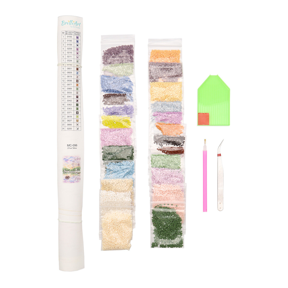 | В набор входит | Холст с клеевым слоем и условными обозначениями (схема), акриловые клеевые стразы 2,5*2,5 мм - 24 цвета, стилус, пинцет, контейнер для страз прямоугольный, силикон, инструкция. |
