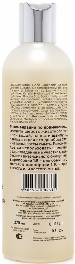 | Эффект | антибактериальный; восстановление; дезодорирующий; облегчение расчесывания; освежение; очищение; придание блеска шерсти; текстурирующий; увлажнение; укрепление |