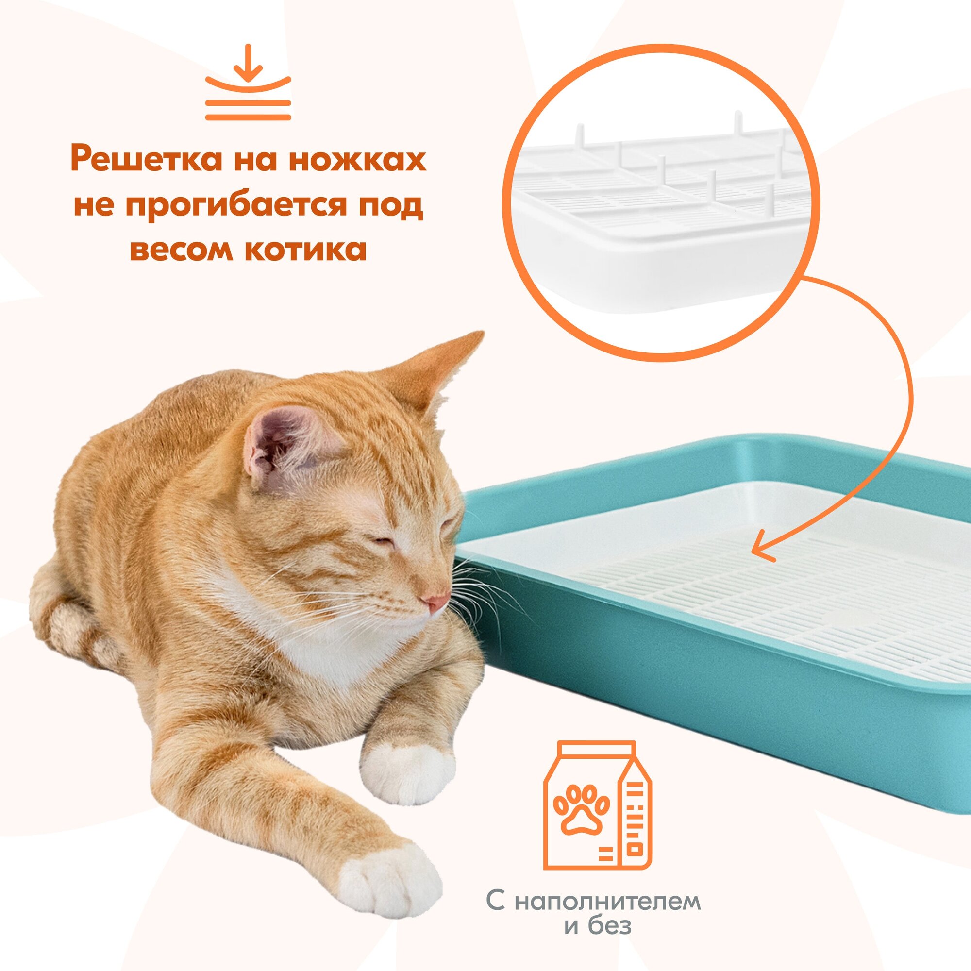 Туалет для кошек. Изготовлен из полипропилена. Состоит из поддона и сетки. Цвет поддона бирюзовый, сетка белая. Размер 40см*26см, высота бортика 6,5см.