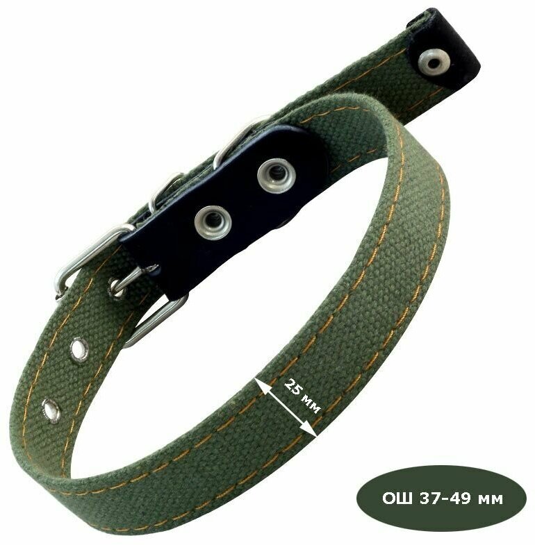 Одинарный прошитый ошейник из брезента с кожаным подпряжником и прочным кольцом для крепления поводка или водилки. Такой ошейник отлично подойдет для собак небольших пород (размеры изделия 530х25 мм). Материал прочный и износостойкий, а длина изделия удобно регулируется. Цвет: хаки.