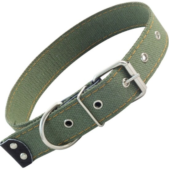 Одинарный прошитый ошейник из Брезента с Кожаным подпряжником и прочным кольцом для крепления поводка или водилки. Такой ошейник отлично подойдет для собак средних пород (размеры изделия 690х35 мм). Материал прочный и износостойкий, а длина изделия удобно регулируется.