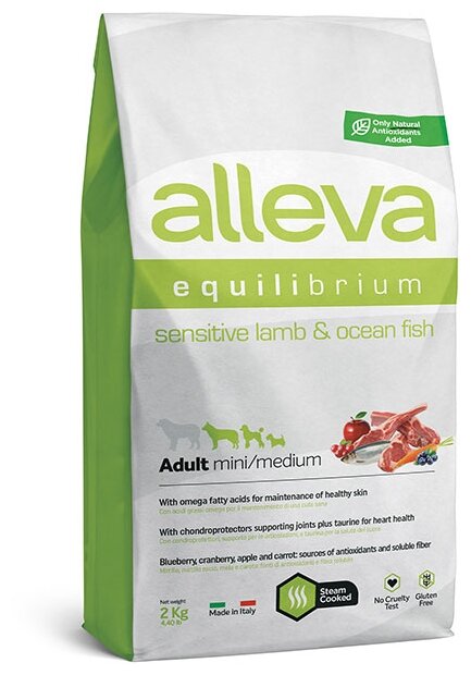 Alleva Equilibrium Sensitive Mini&Medium с ягненком и рыбой. Сухой корм Аллева с ягненком и рыбой предназначен для взрослых собак мелких и средних пород . По ингредиентному составу относится к кормам суперпремиум класса. Содержит все витамины и минеральные вещества необходимые для повседневного здорового питания вашего питомца.