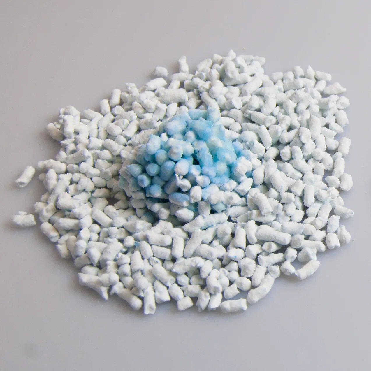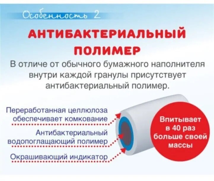 Каждая гранула многослойна. Японский антибактериальный влагопоглощающий полимер быстро и эффективно впитывает влагу, другой (СРС)– уничтожает источник неприятных запахов – бактерии. Комкуется благодаря целлюлозной клейковине, комок становится голубого цвета, не окрашивая лапы и стены лотка. Каждая гранула обработана катехином японского чая, имеющим прекрасные дезодорирующие свойства и горький вкус (безопасное отучение от поедания наполнителя).