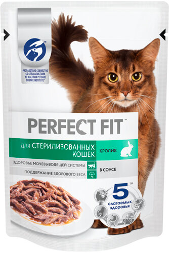 Влажный корм в паучах PERFECT FIT с кроликом в соусе для стерилизованных кошек разработан по специальной рецептуре для контроля здоровья кошек, прошедших стерилизацию. Здоровье мочевыводящей системы Поддерживает здоровье мочевыводящей системы у стерилизованных кошек, подверженных повышенному риску развития мочекаменной болезни Поддержание здорового веса Специальный ингредиент L-карнитин способствует сжиганию жиров, помогая поддерживать здоровый вес