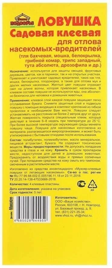 | Дополнительно | Используется для защиты овощей, фруктовых деревьев, цветов, как в парниках, так и на открытых участках. Для теплиц, 4 пластины ∎ от тли бахчевой, мошки, белокрылки, грибного комара, трипса западного, туты абсолюты, дрозофилы и др. |