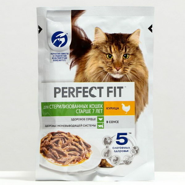 Влажный корм в паучах PERFECT FIT™ с курицей в соусе для стерилизованных кошек старше 7 лет содержит таурин, антиоксиданты и другие необходимые компоненты для стареющих кошек.