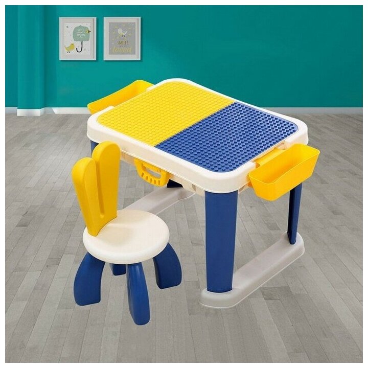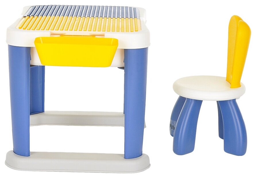 Столешница стола двухсторонняя: на одной стороне можно играть с любыми игрушками, заниматься рисованием и другими играми, другая сторона предназначена для игр с конструктором. Под столом имеется ящик для хранения всяких мелочей. С 2-х сторон от стола имеется емкости для хранения деталей конструктора.