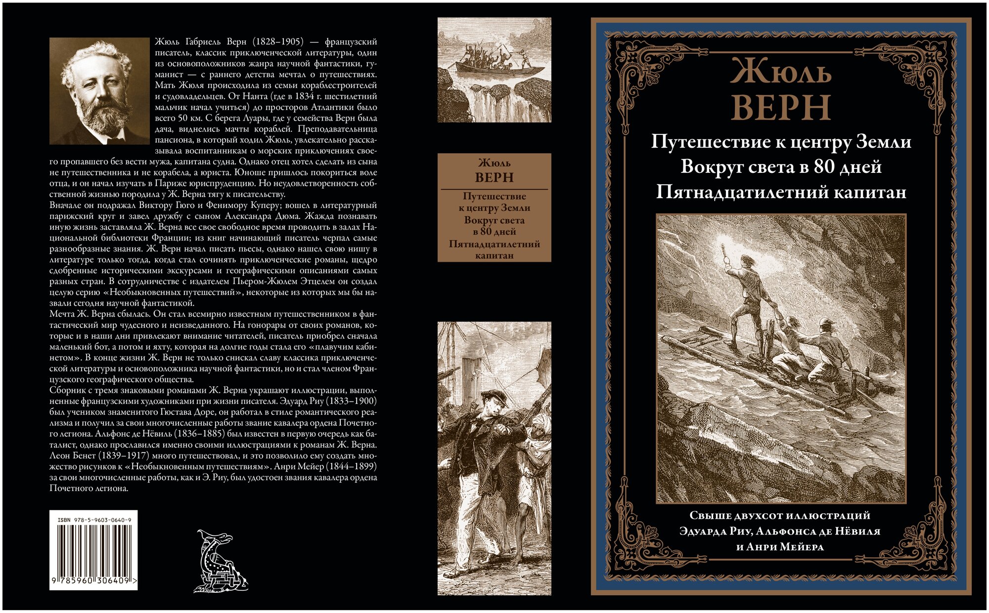 Подарочное иллюстрированное издание отпечатано на импортной пигментированной книжно-дизайнерской бумаге Лакс Крим (Lux Cream) с закладкой ляссе одного цвета с капталом. В сборник Жюля Верна, которого справедливо считают основоположником научной фантастики, вошли три наиболее крупных и захватывающих произведения писателя. " Путешествие к центру Земли" проиллюстрировано работами знаменитого французского художника XIX в. Эдуара Риу; " Вокруг света за 80 дней" украшают работы французского художника-баталиста Альфонса де Нёвиля и французского иллюстратора Леона Бенета; Рисунки к " Пятнадцатилетнему капитану" выполнены французским художником Анри Мейером.
